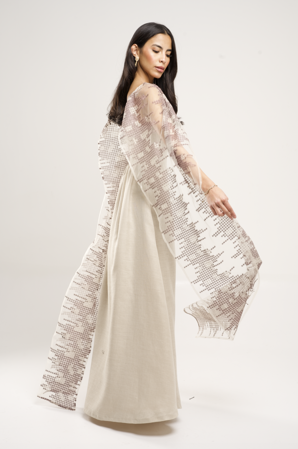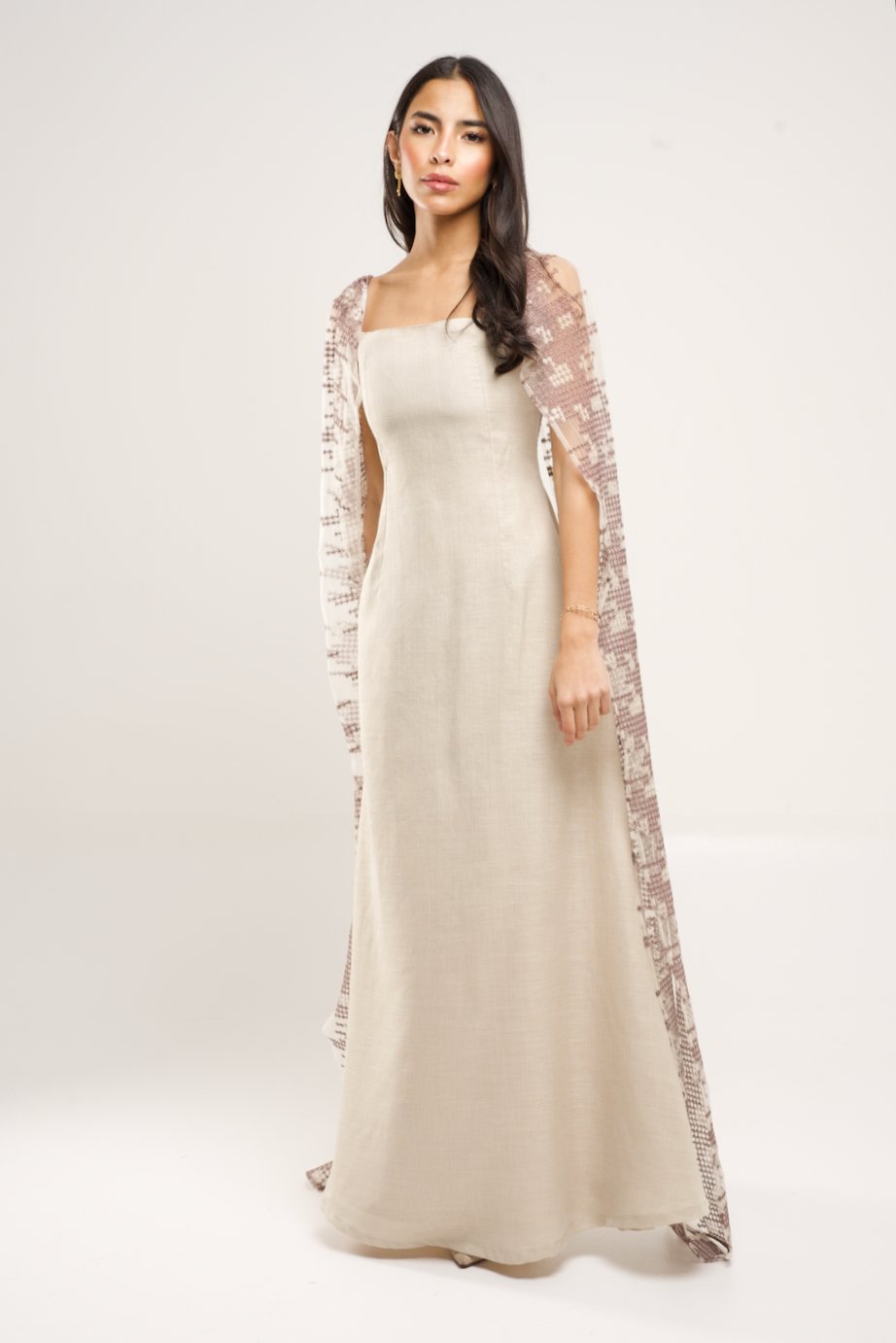 Beige luxury classic linen dress featuring a beautiful wide embroidered tulle sleeves that can be worn in many ways.