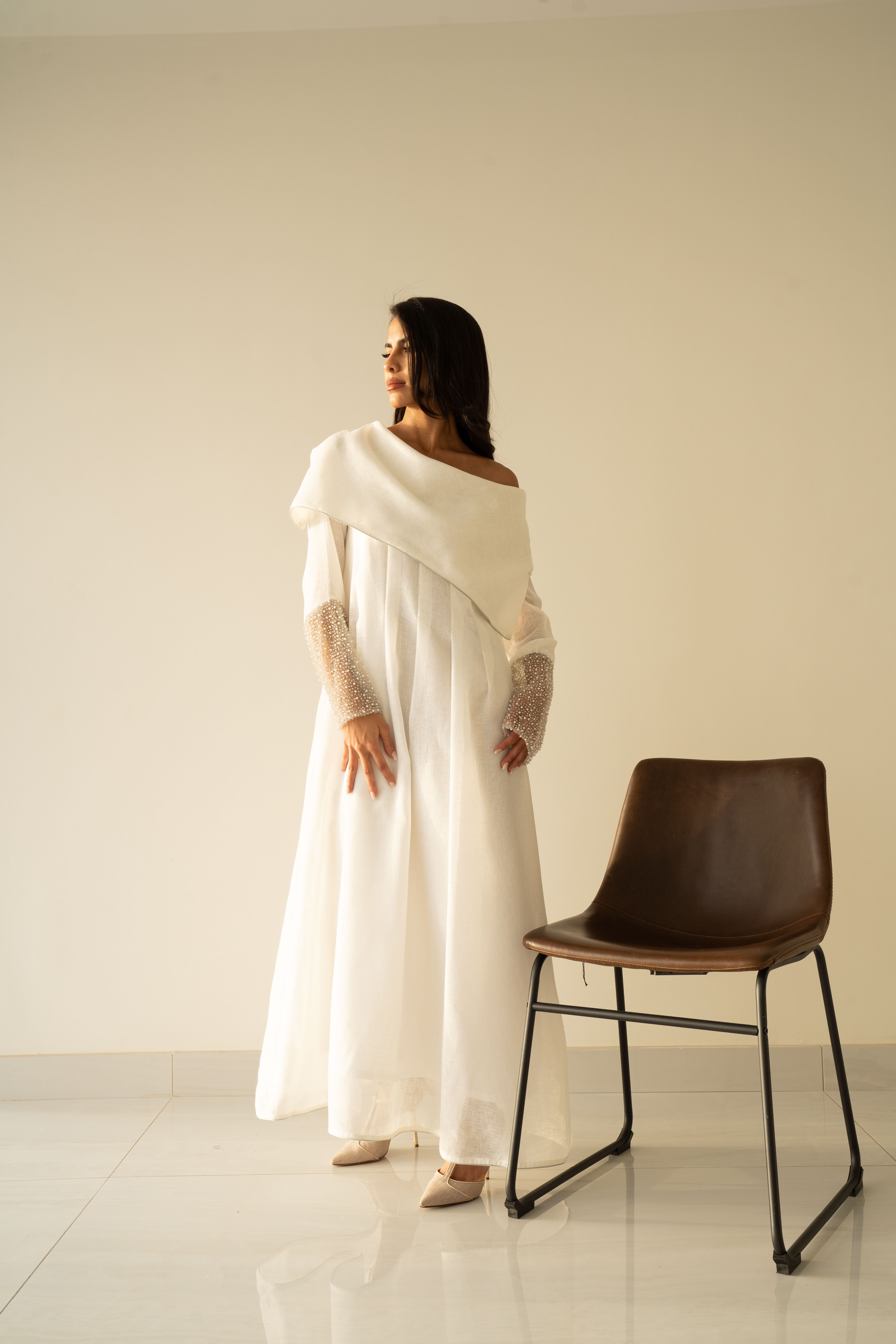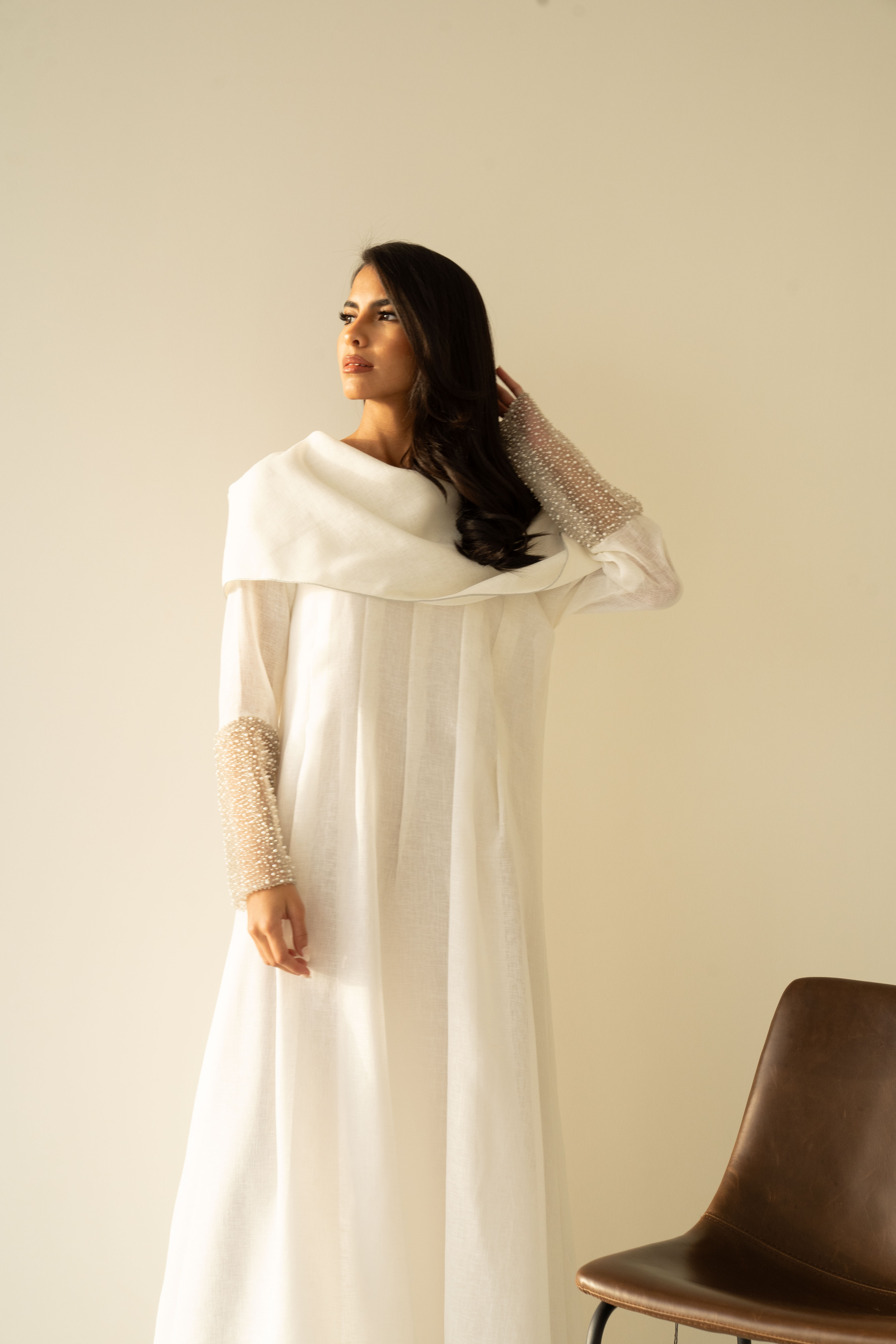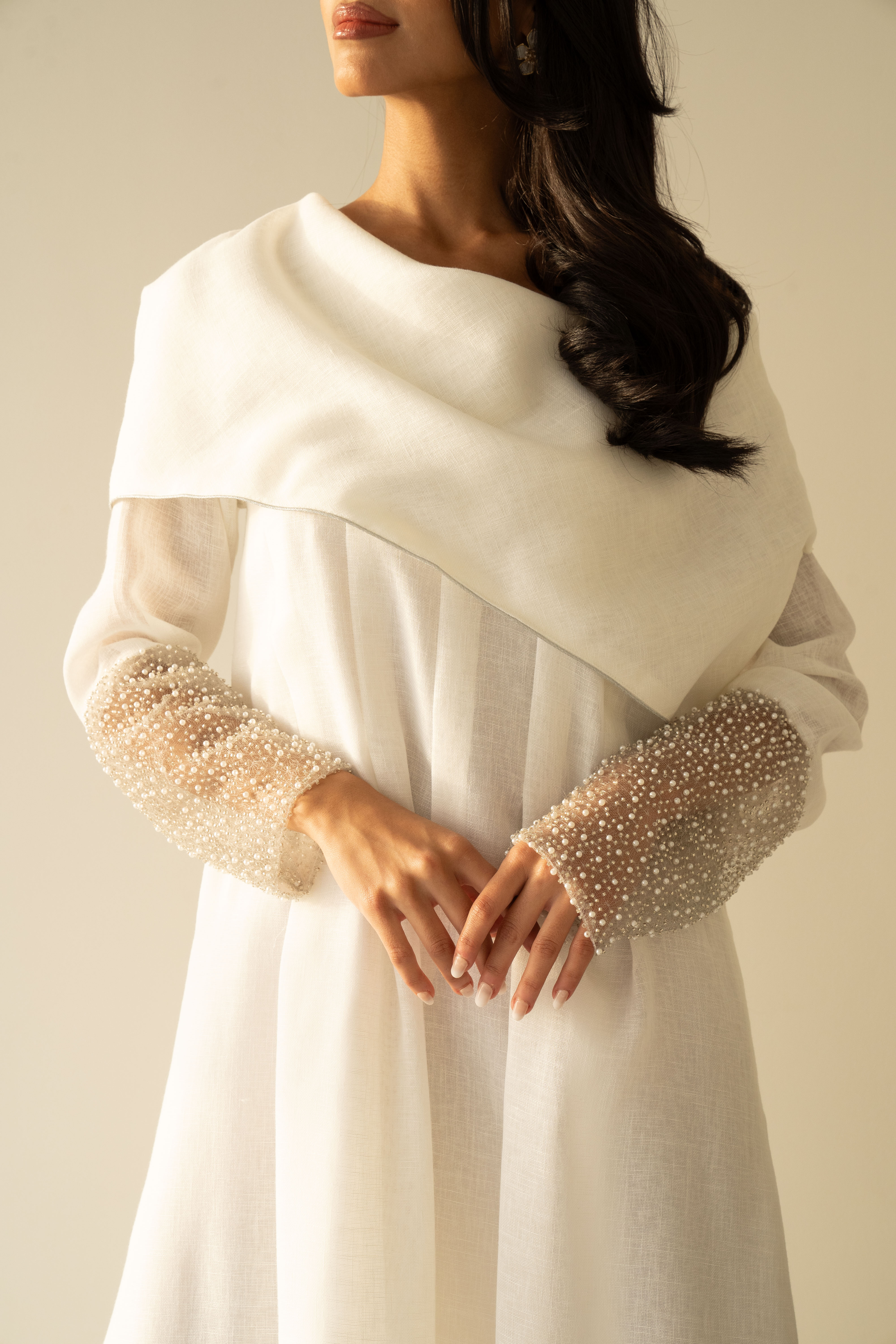 Off white linen dress with pearls tulle details in the hand cuffs.