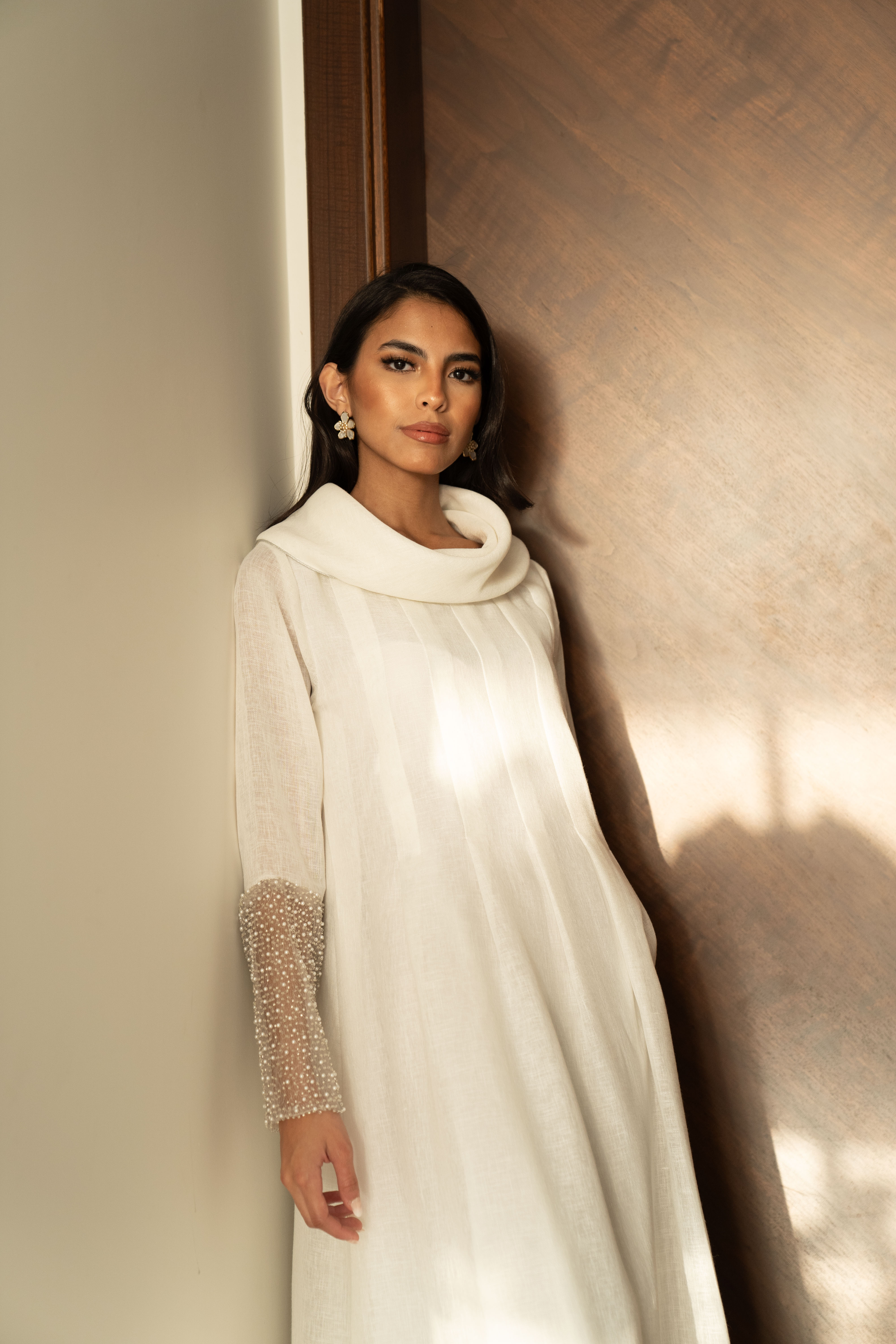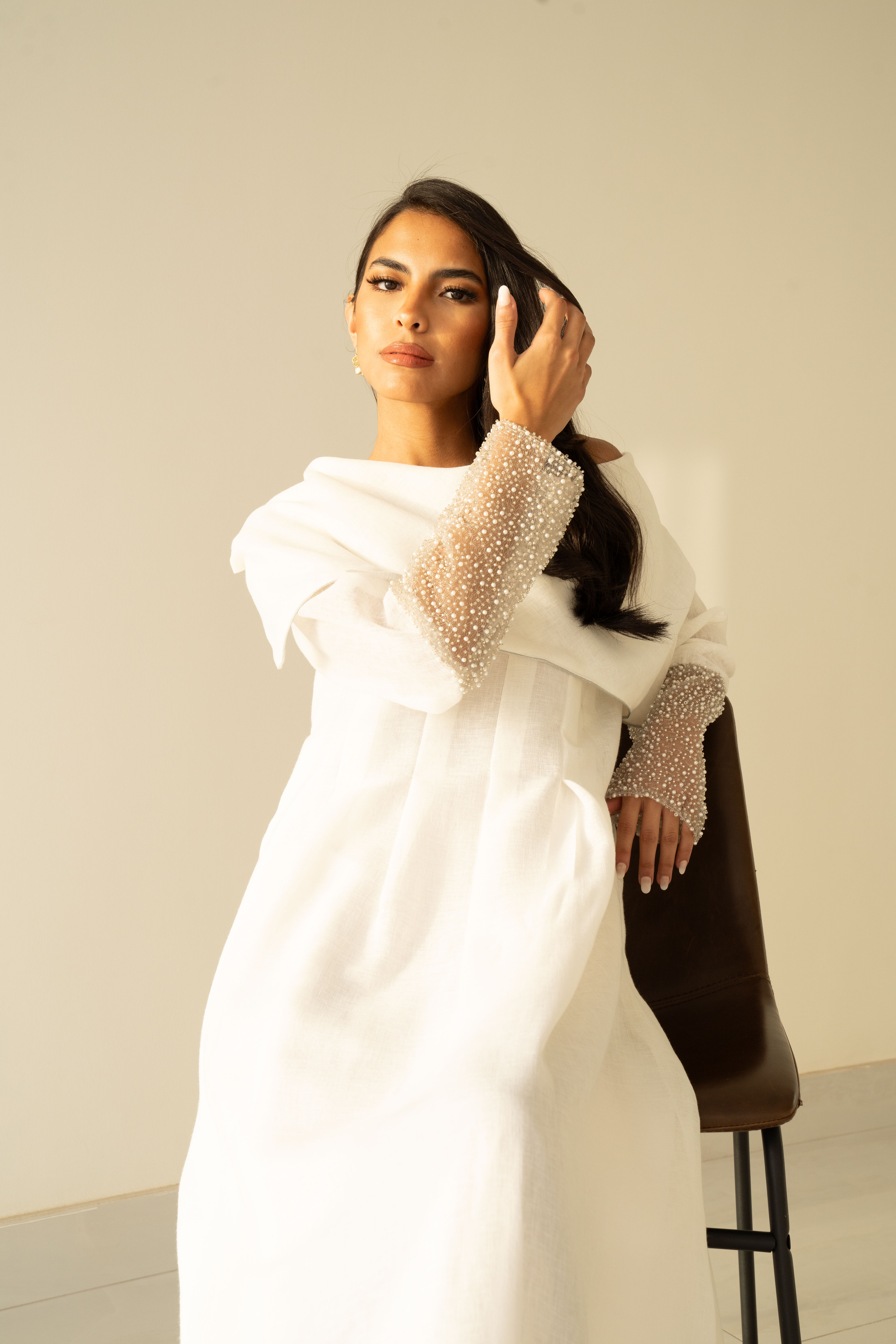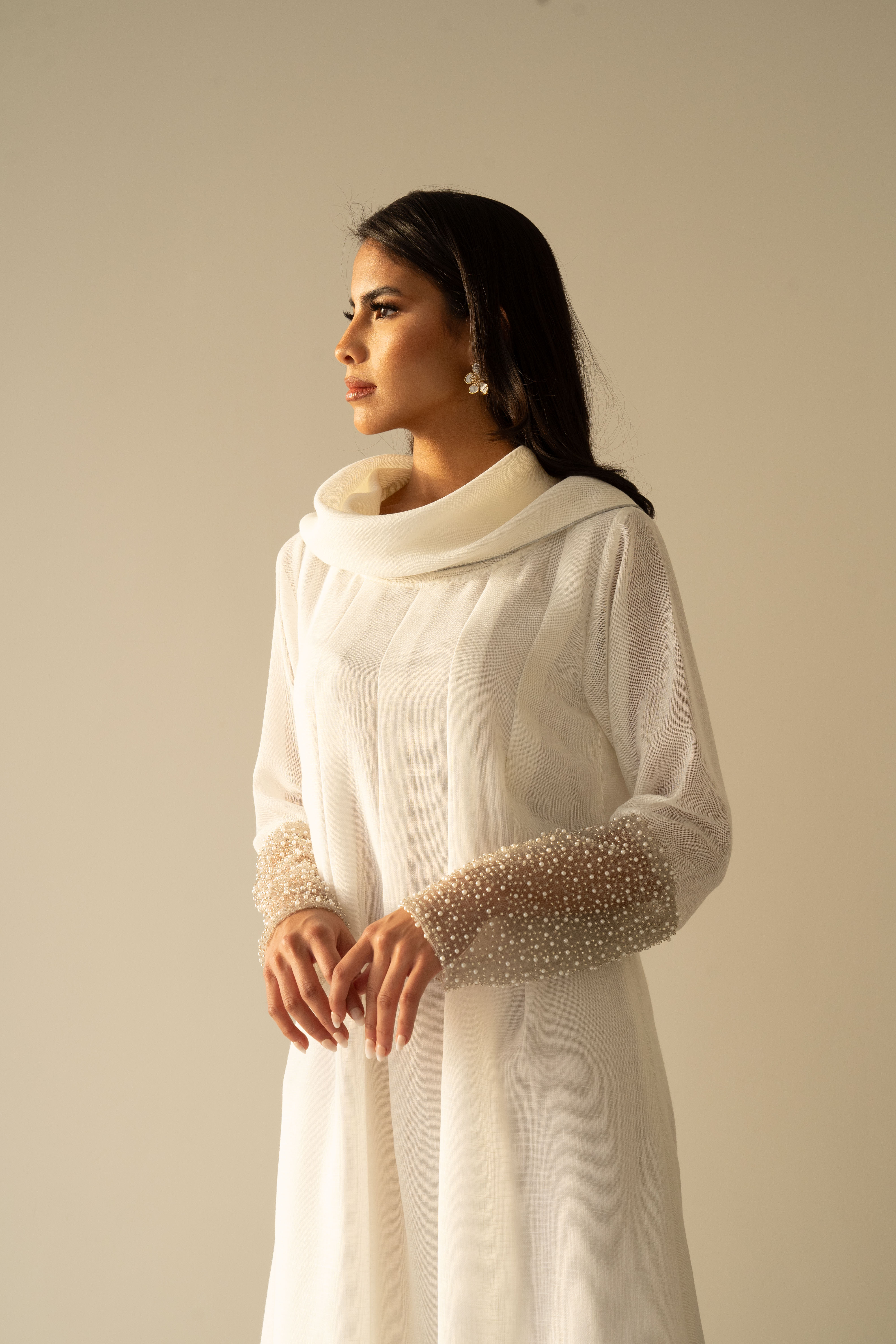 Off white linen dress with pearls tulle details in the hand cuffs.