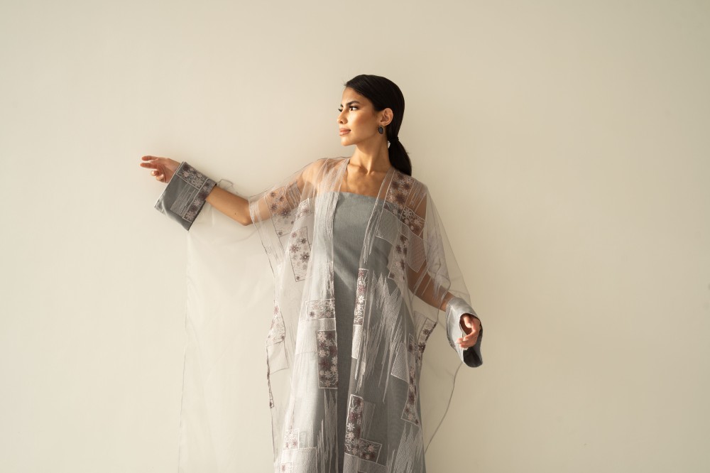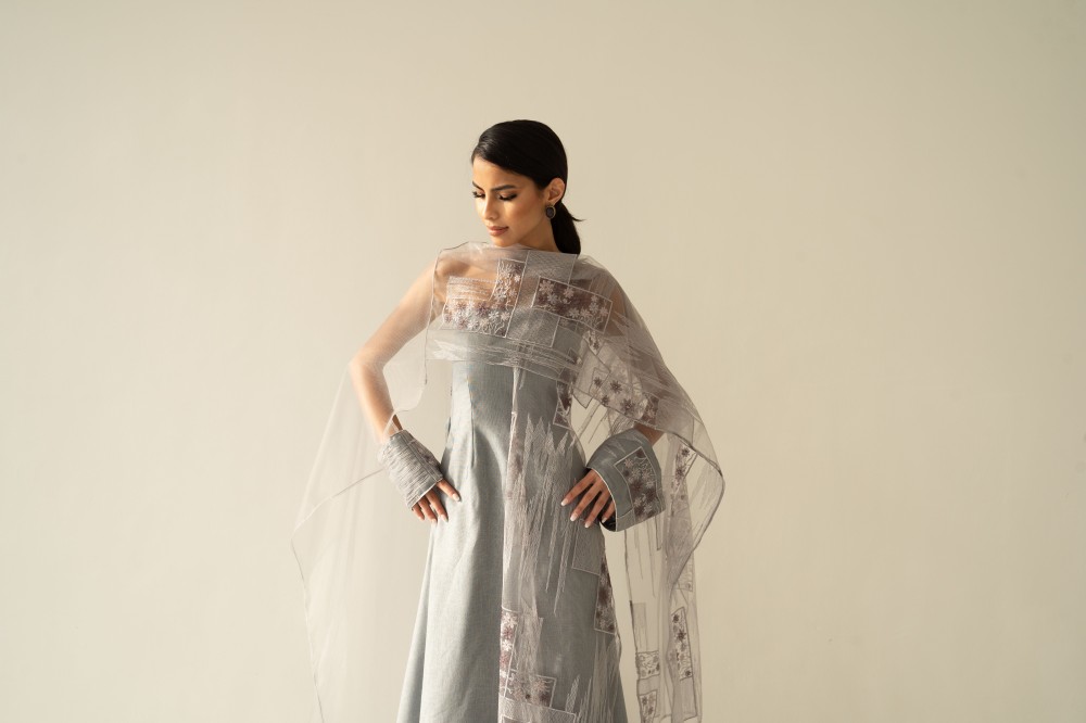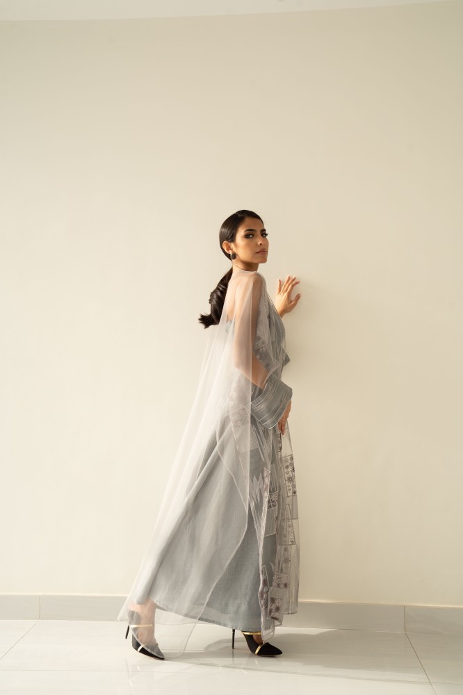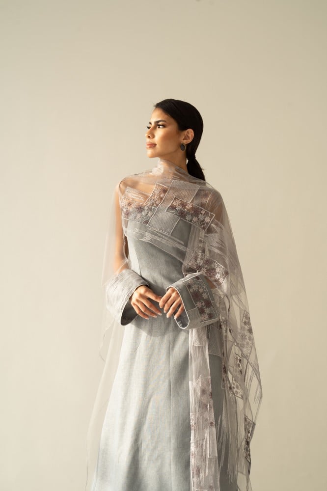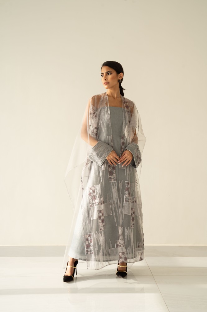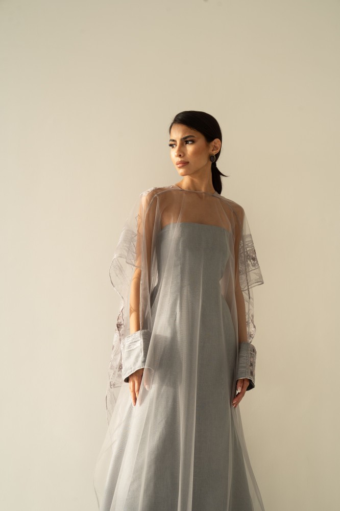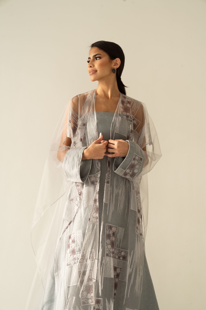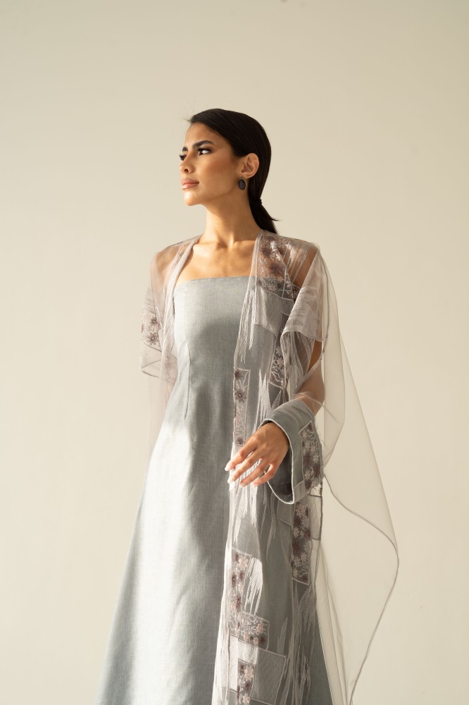 فستان لينن انيق باللون الرمادي مع فستان تل باللون الرمادي الفاتح مطرز بنقشة الورود