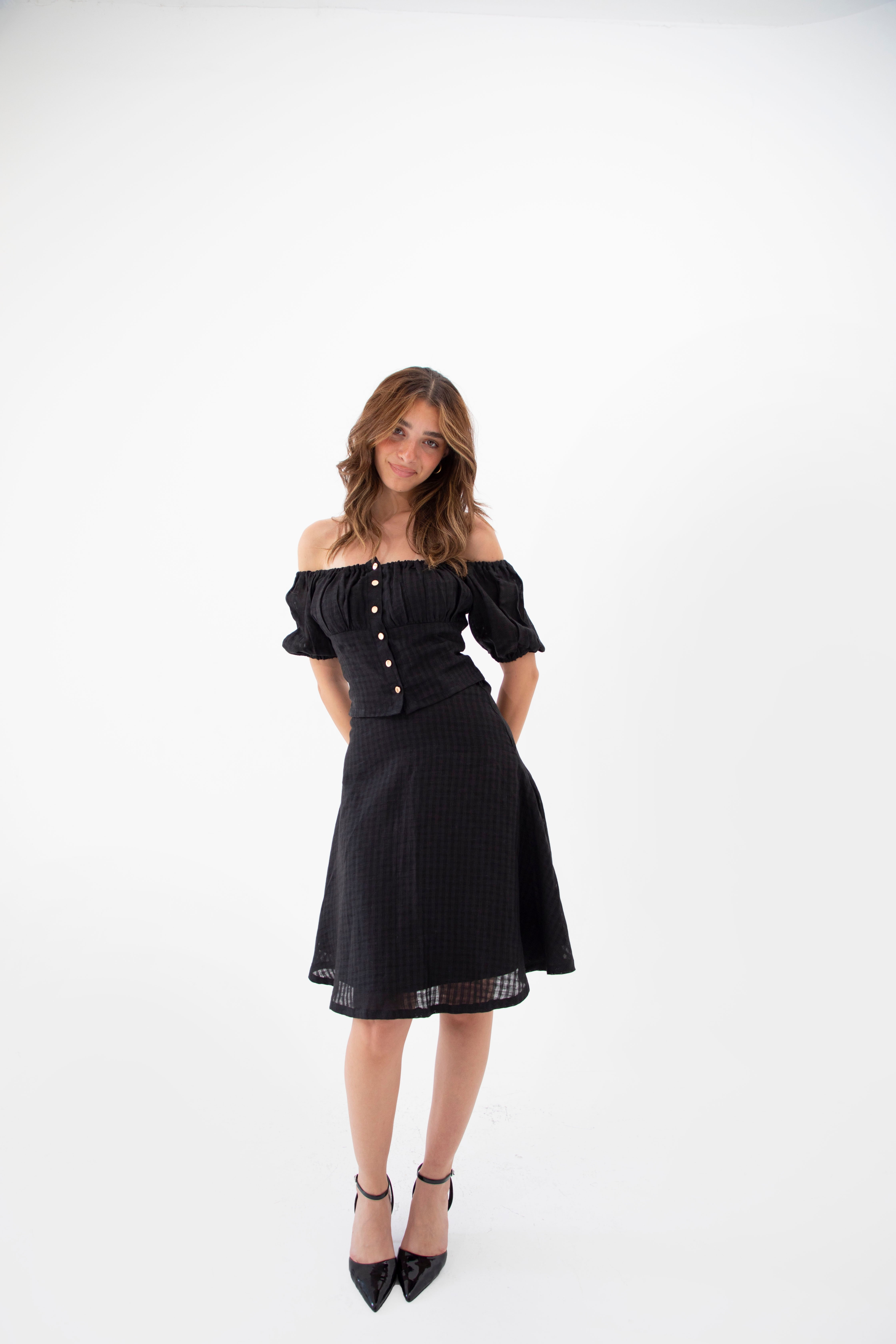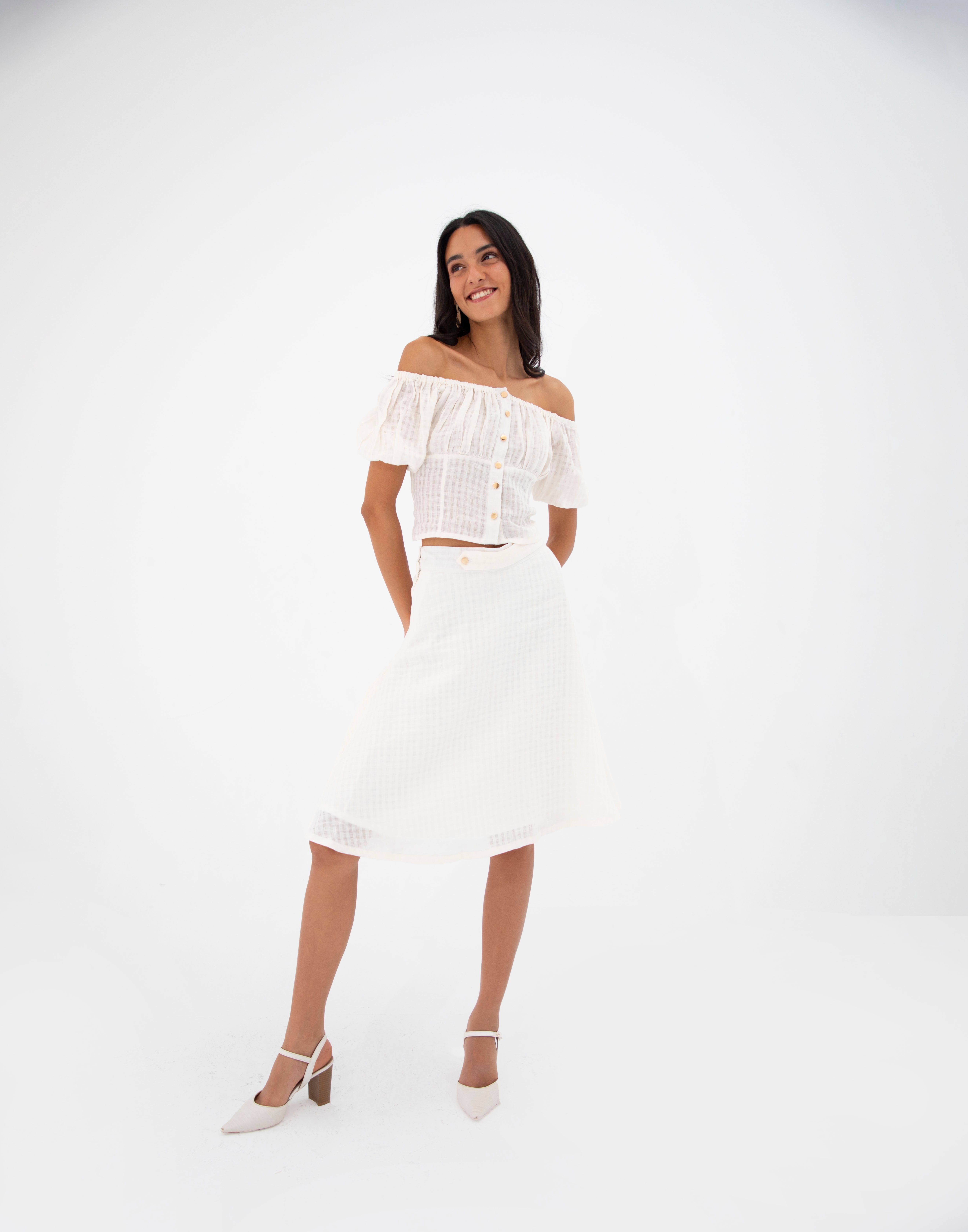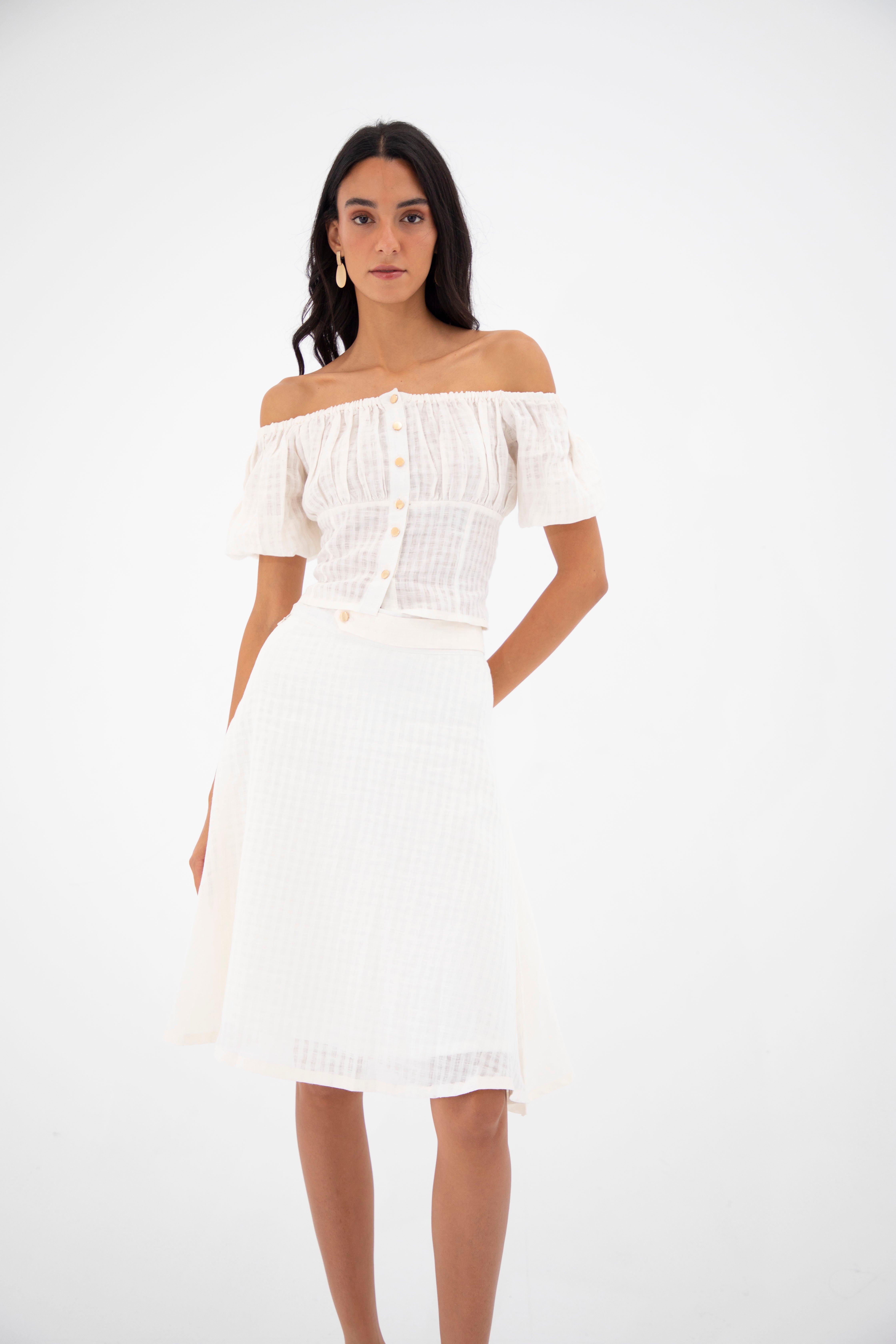 Off-shoulder linen top featuring a front gold buttons. can be styled with our signature linen pants or skirts.