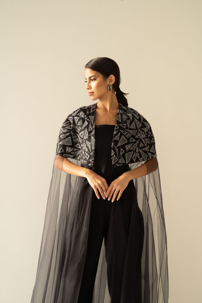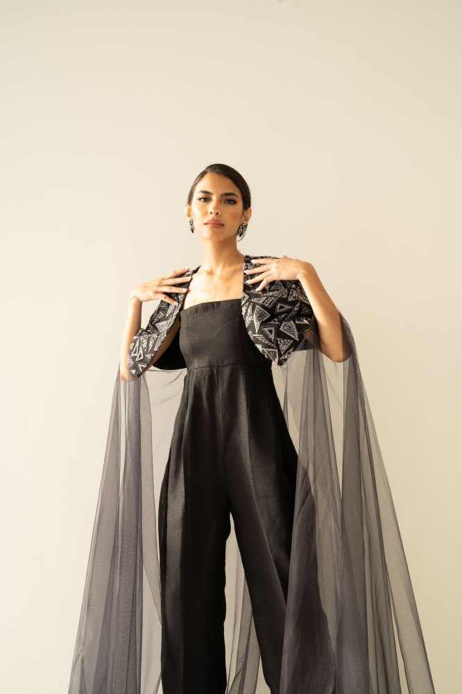 Black linen strapless jumpsuit with handmade embroidered cape.