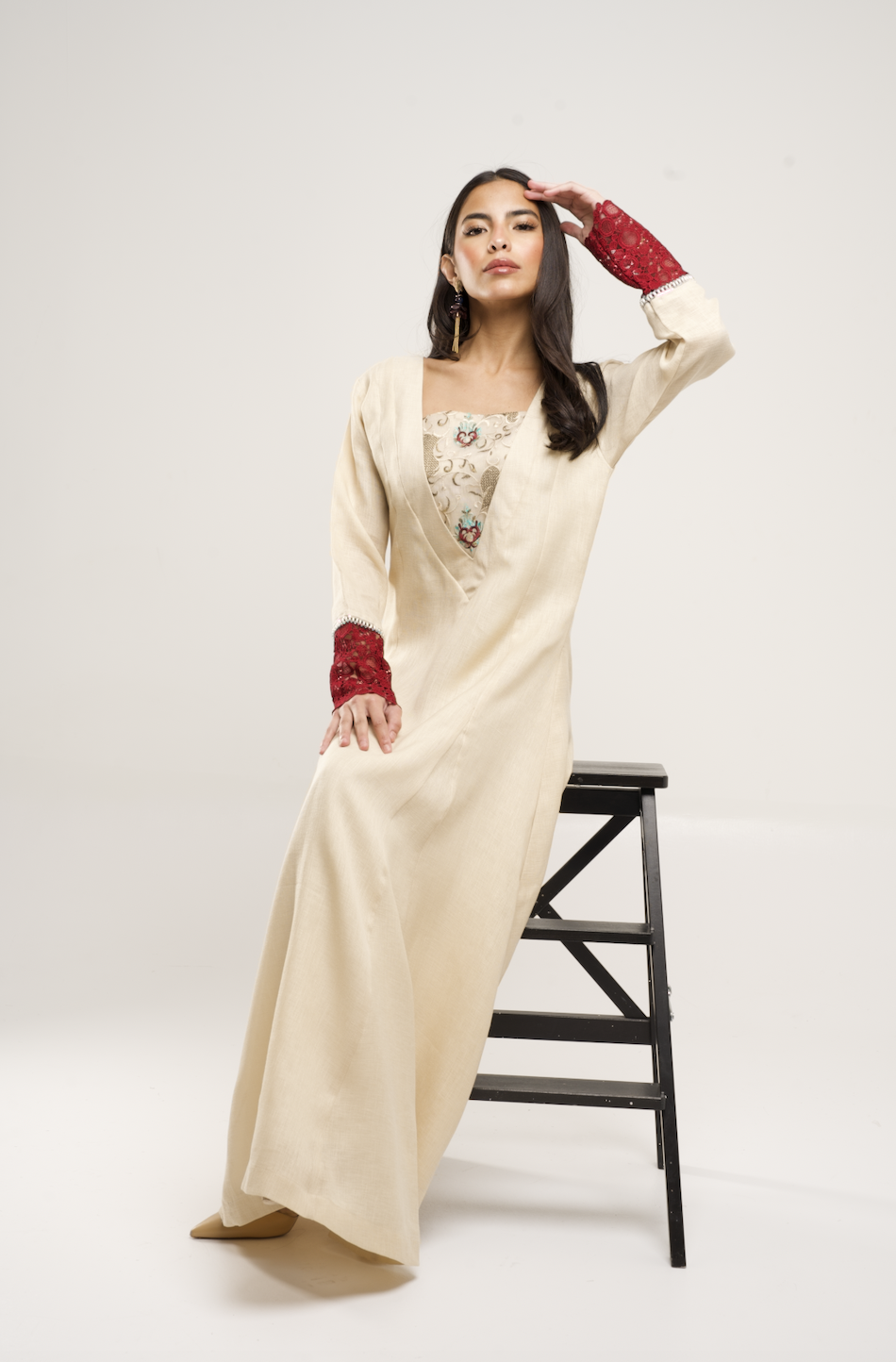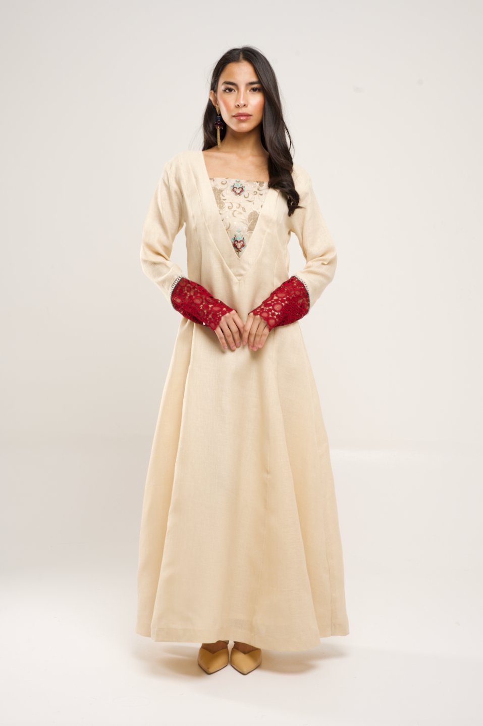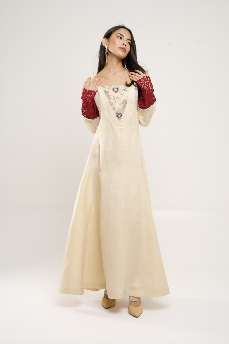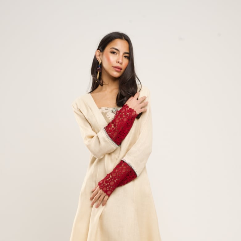 Embroidered Linen thobe/ dress in beige with jaqard sleeves in maroon.