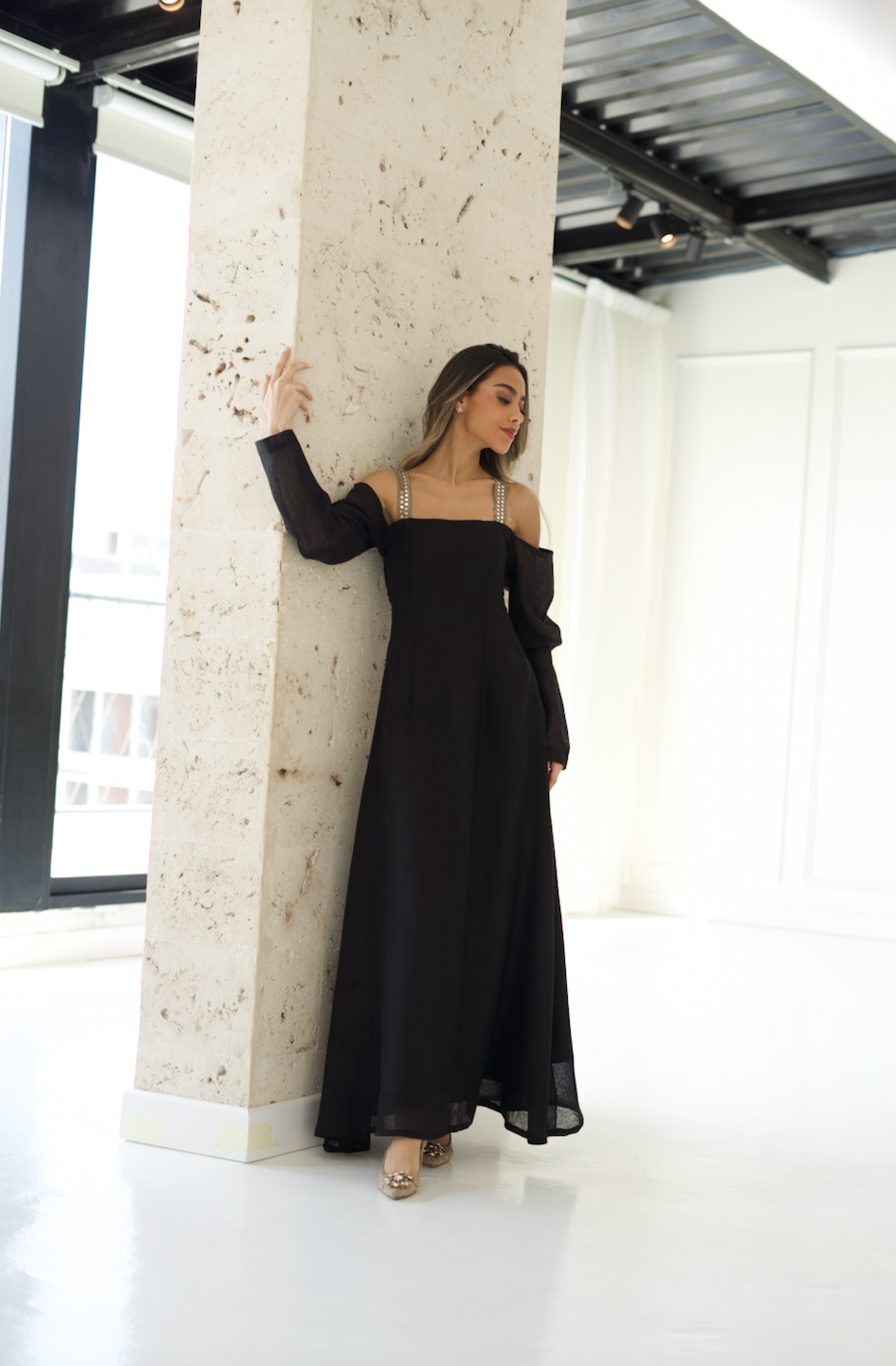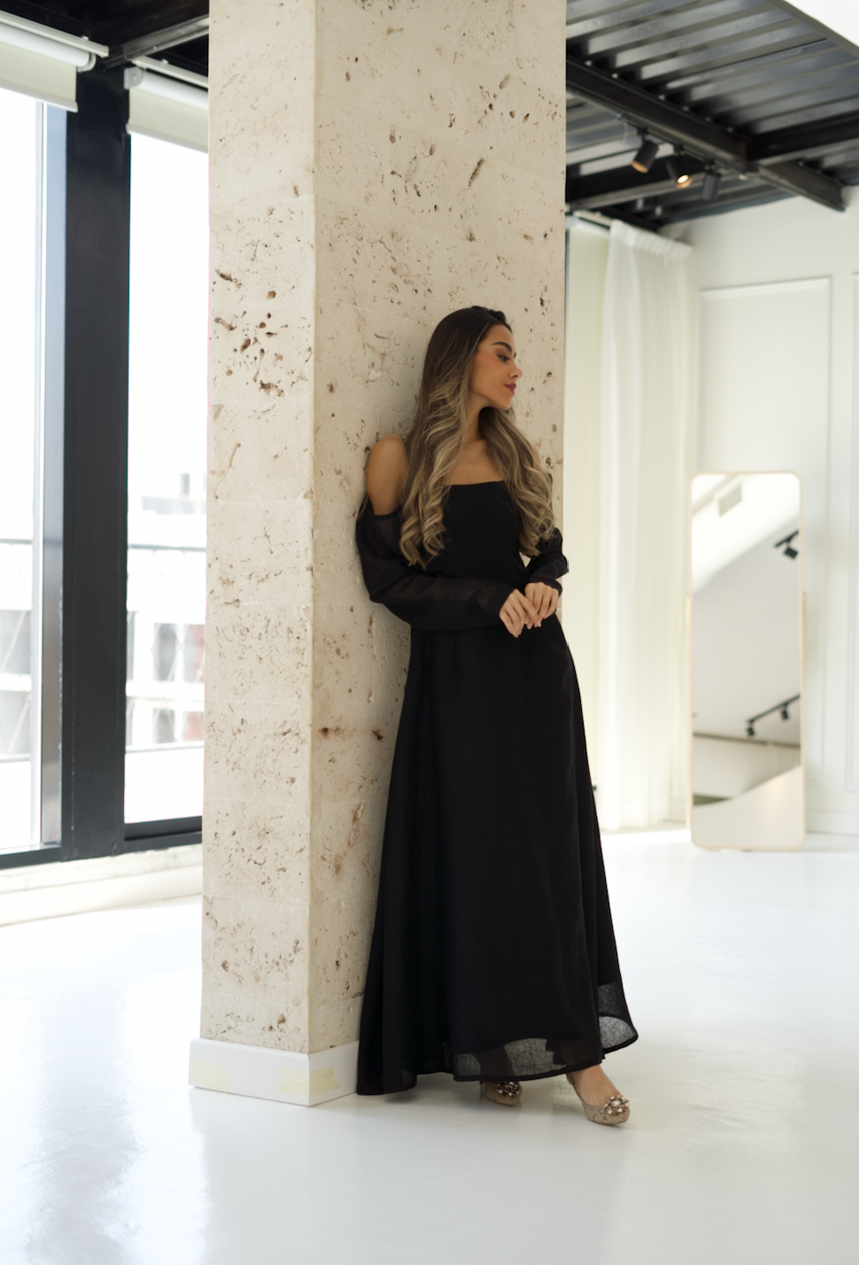 A simple and elegant linen dress in black featured with off shoulder wide cut sleeves.