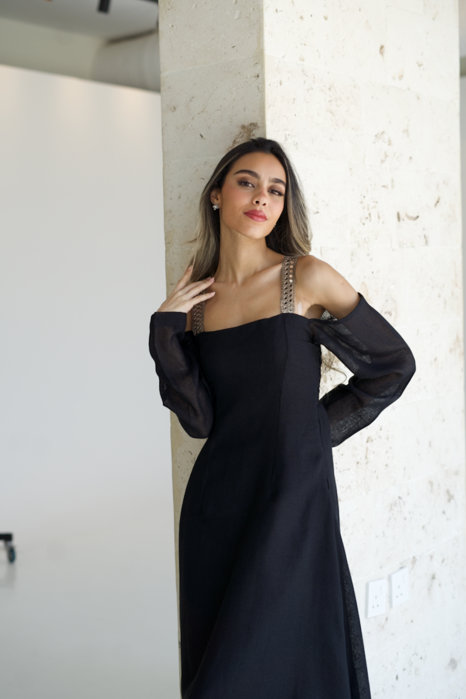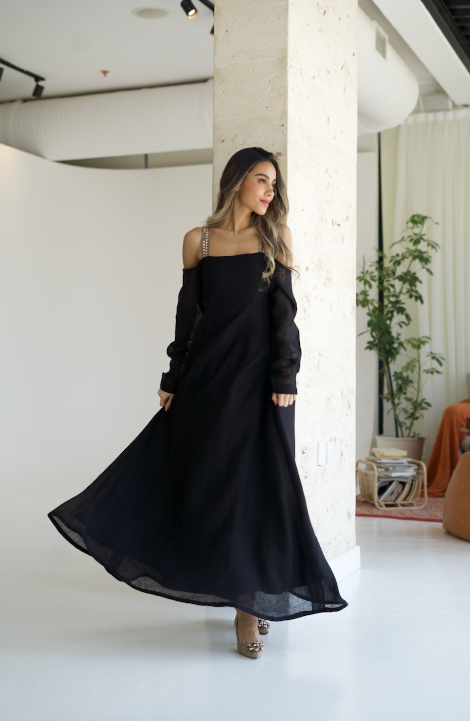 فستان كتان بسيط و أنيق باللون الأسود يتميز بأكمام واسعة مكشوفة الأكتاف