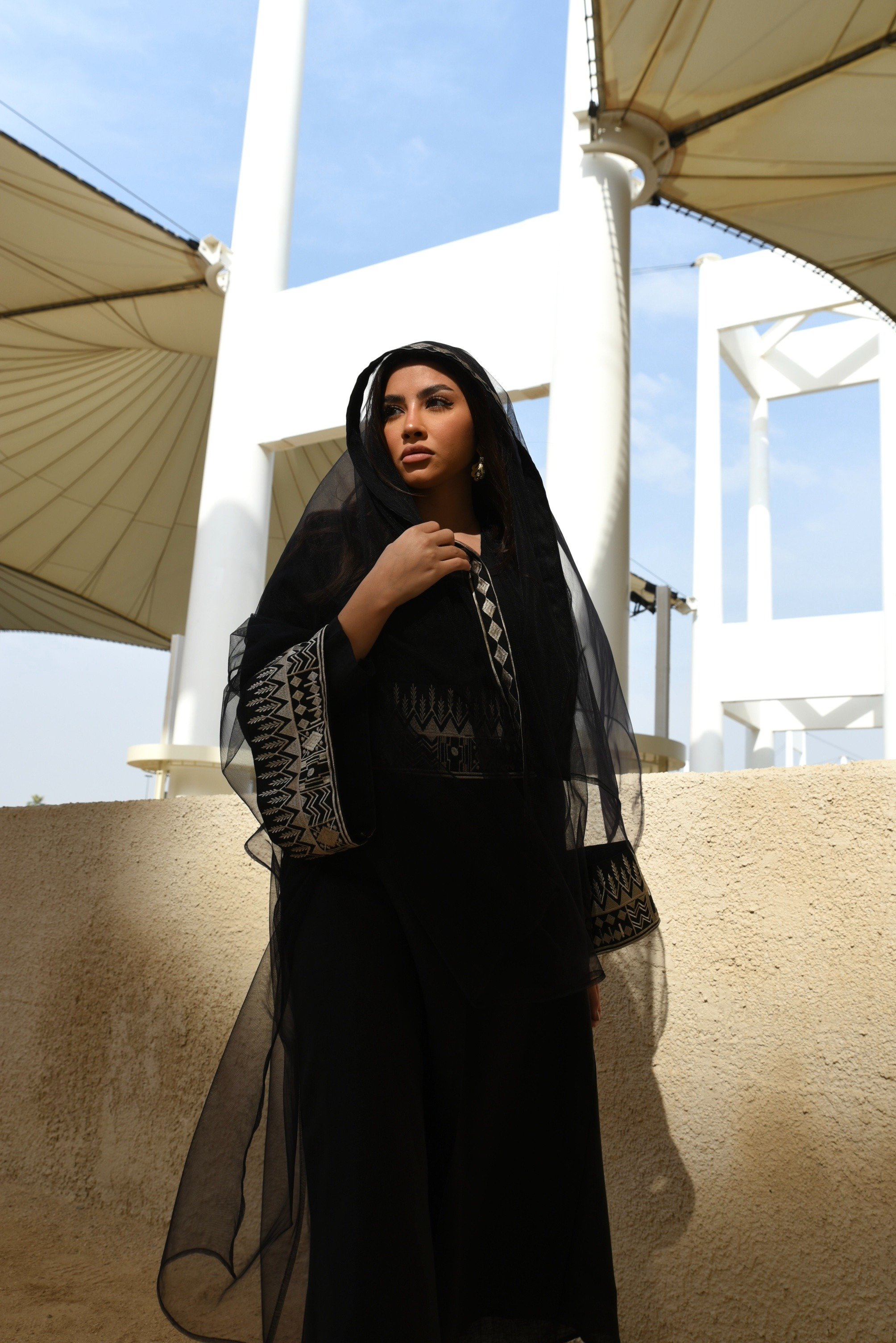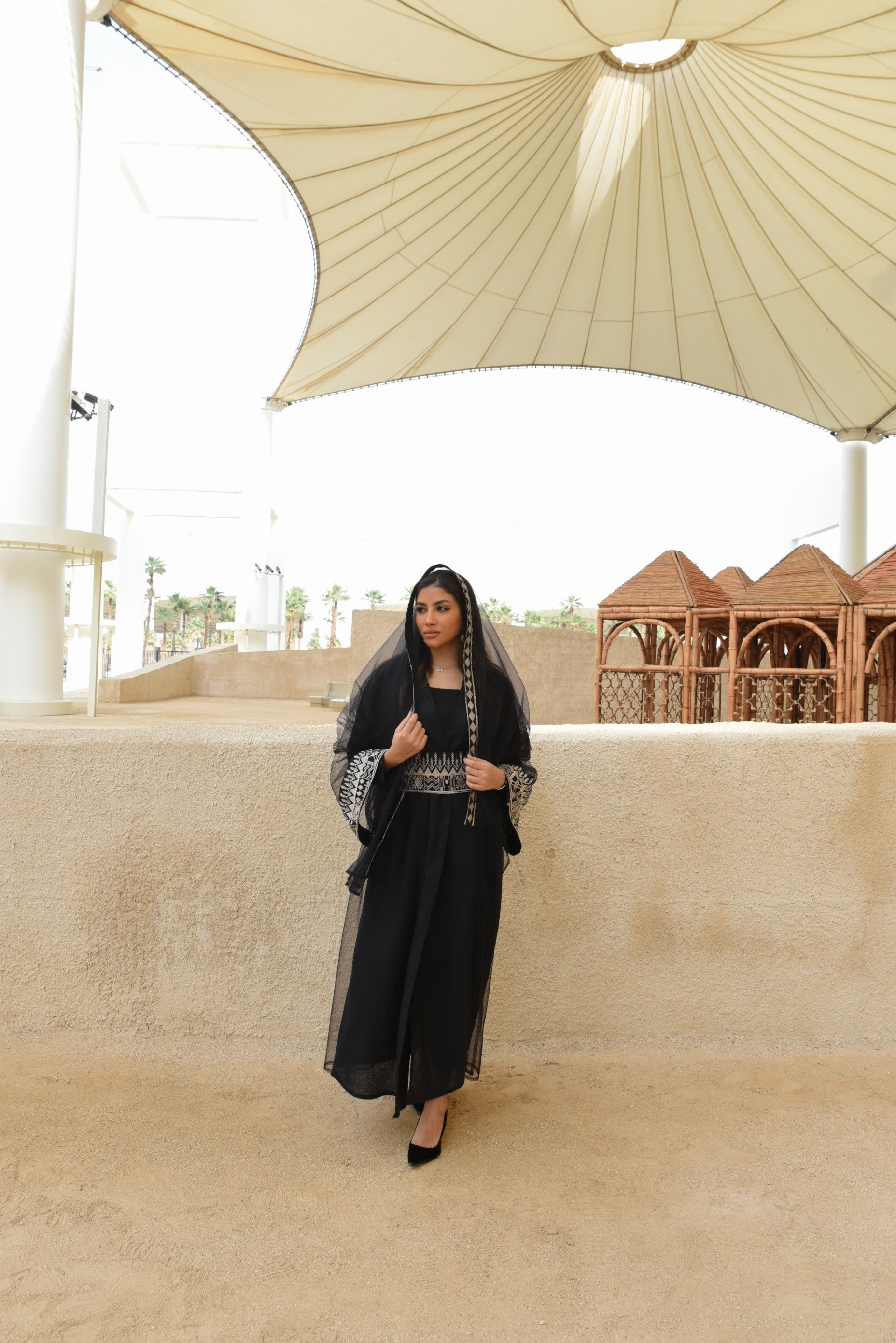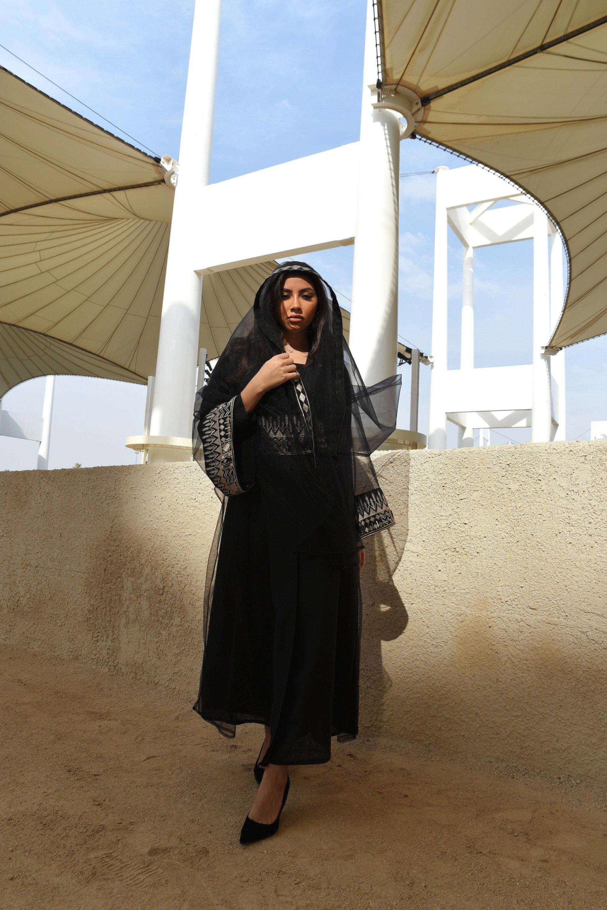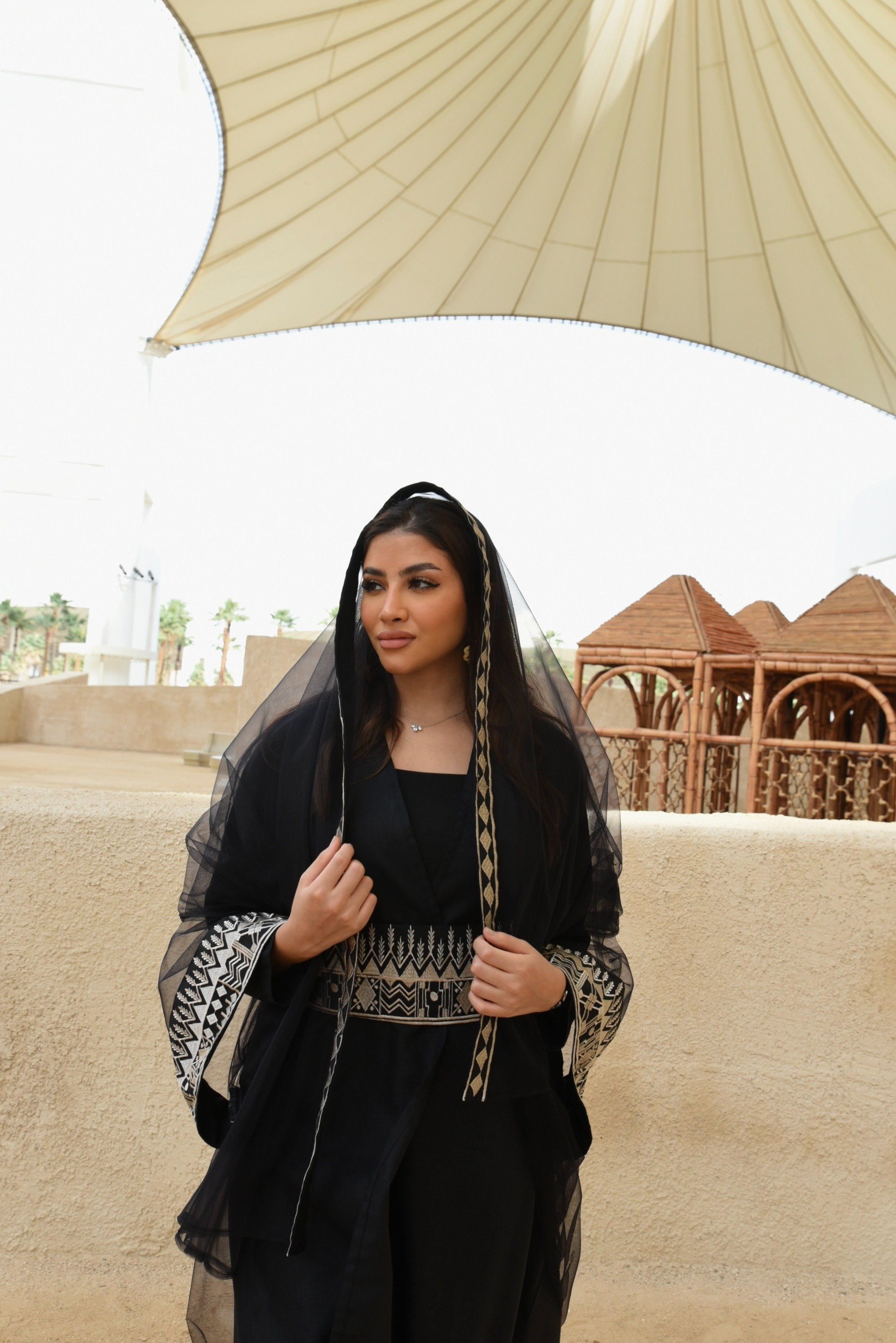Fondation day linen abaya (bisht cut) with external sadu embroidery tulle.