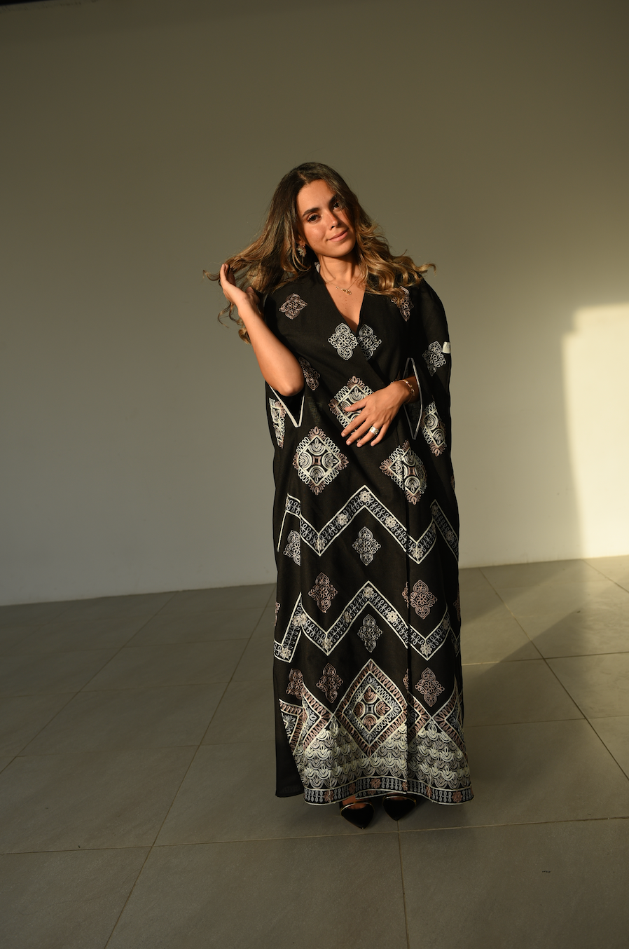 Black linen embroidered cape abaya with tarha