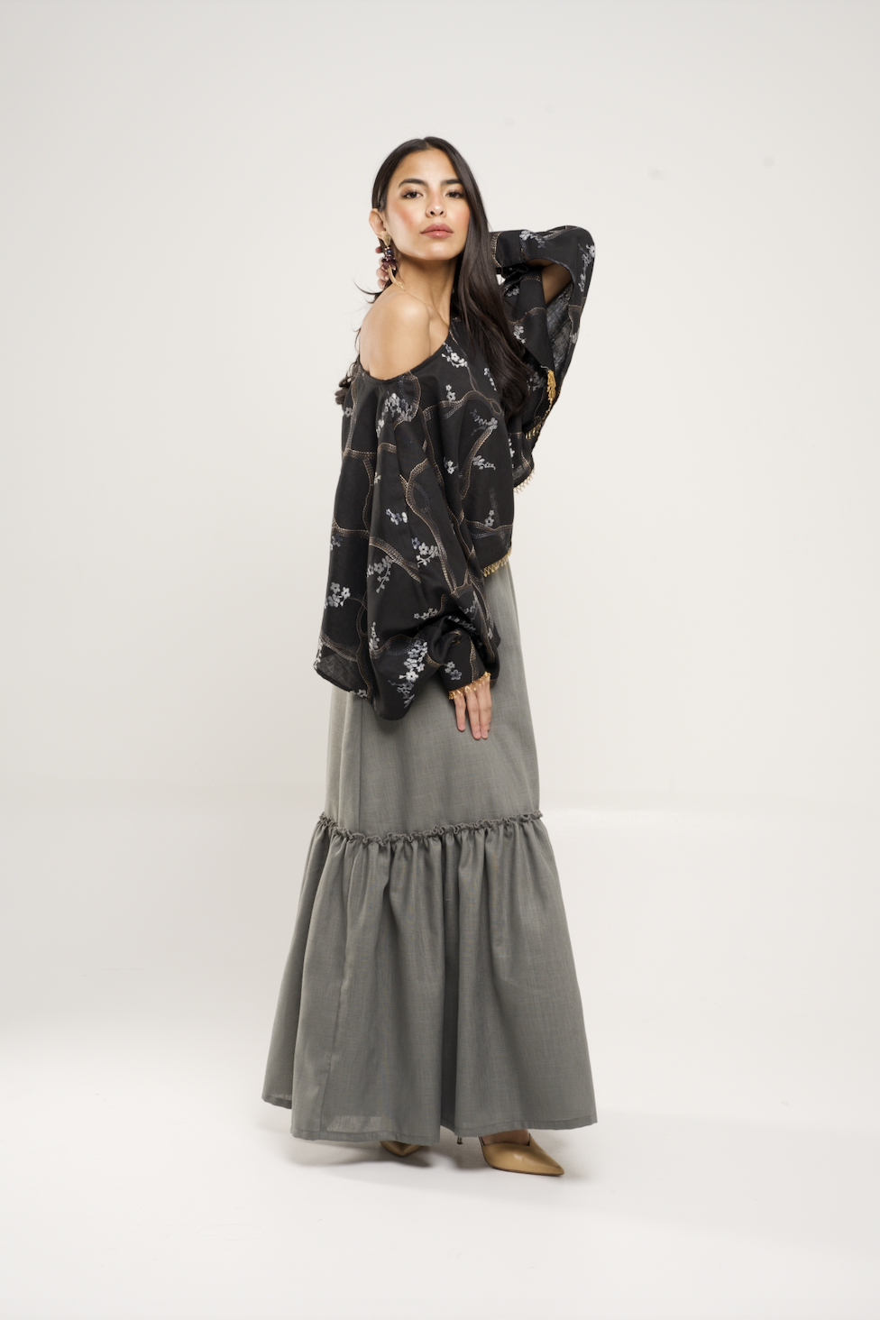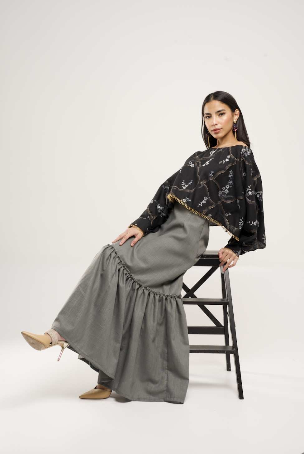 Linen skirt + embroidered linen cape top with internal belt that can be worn in many ways.