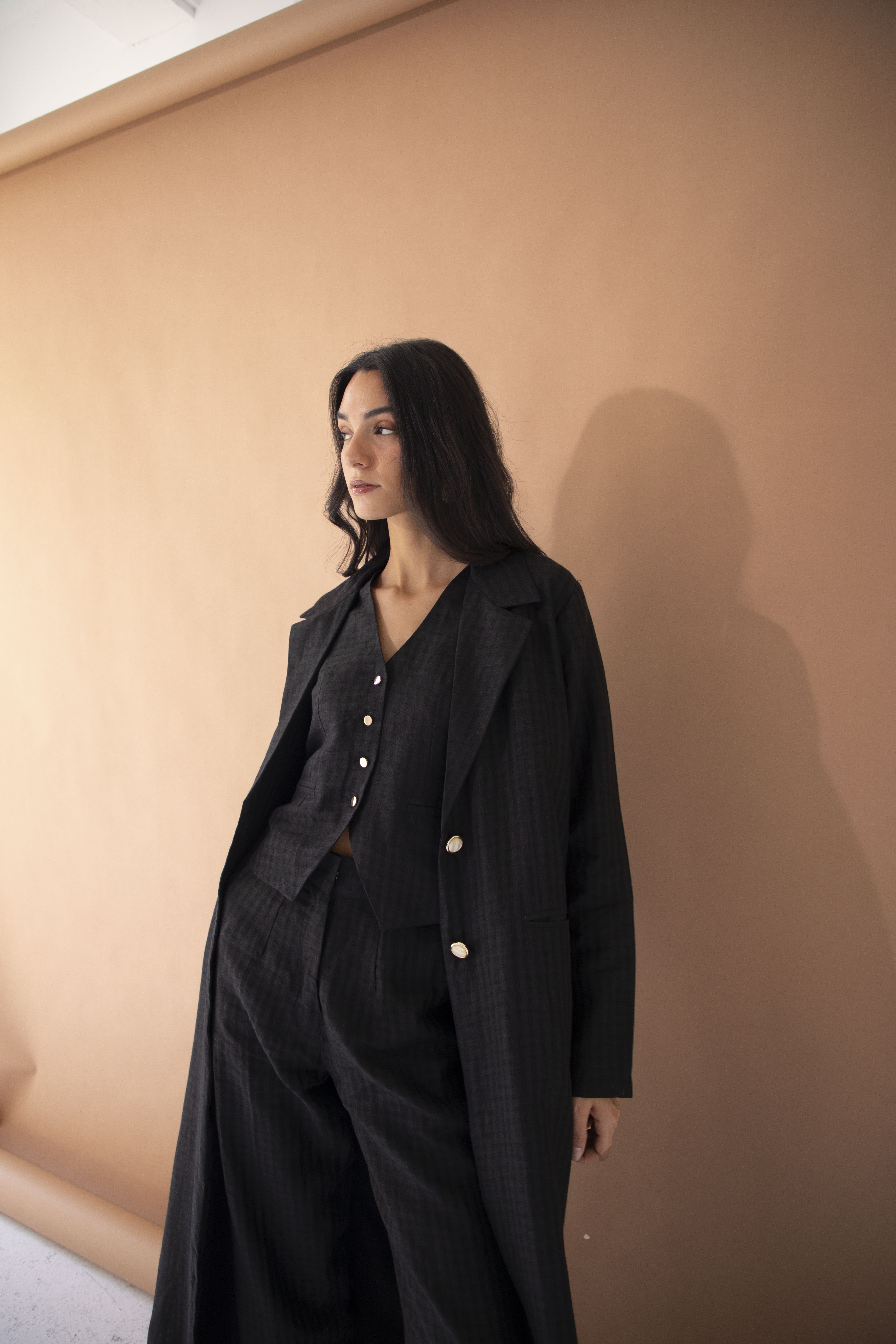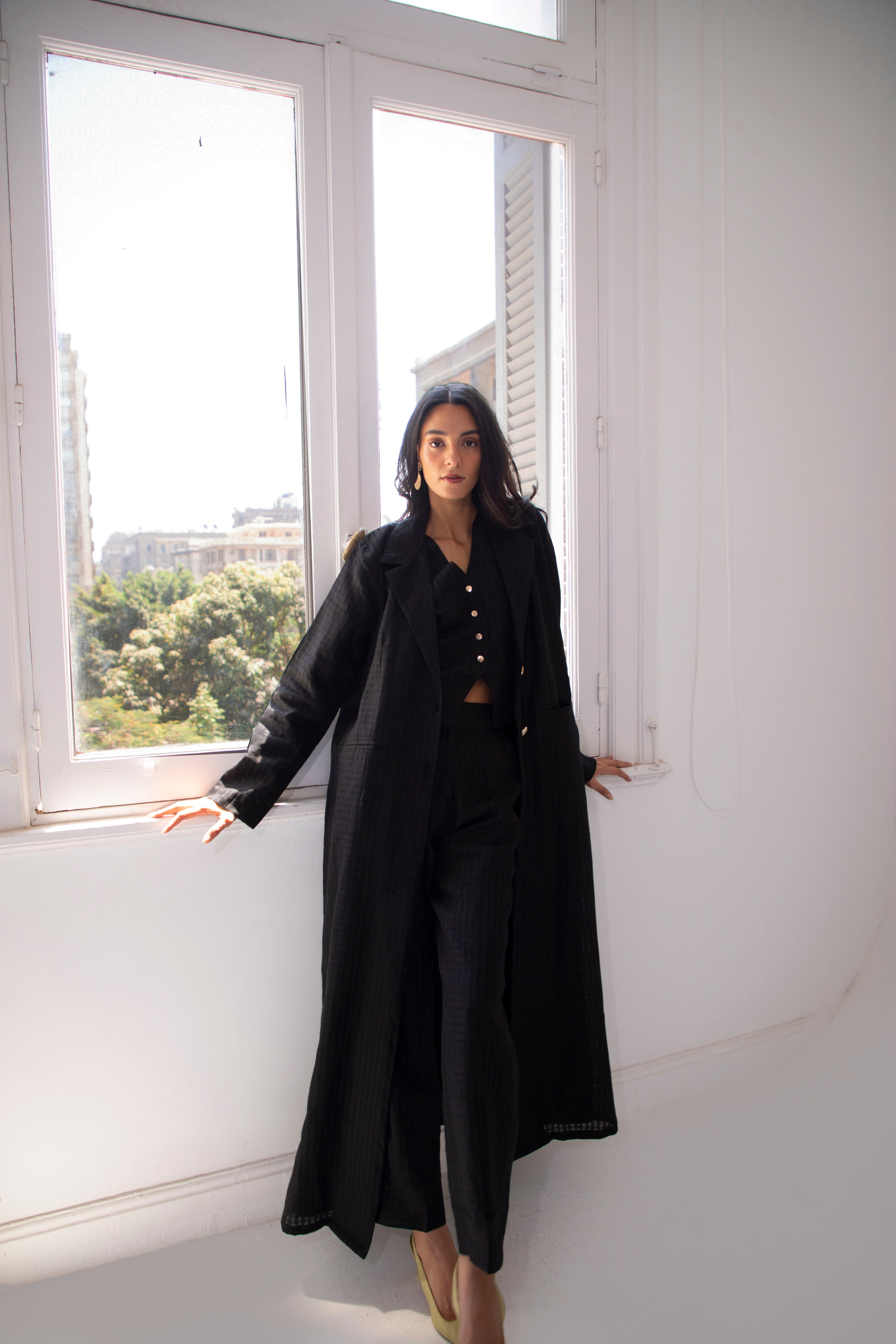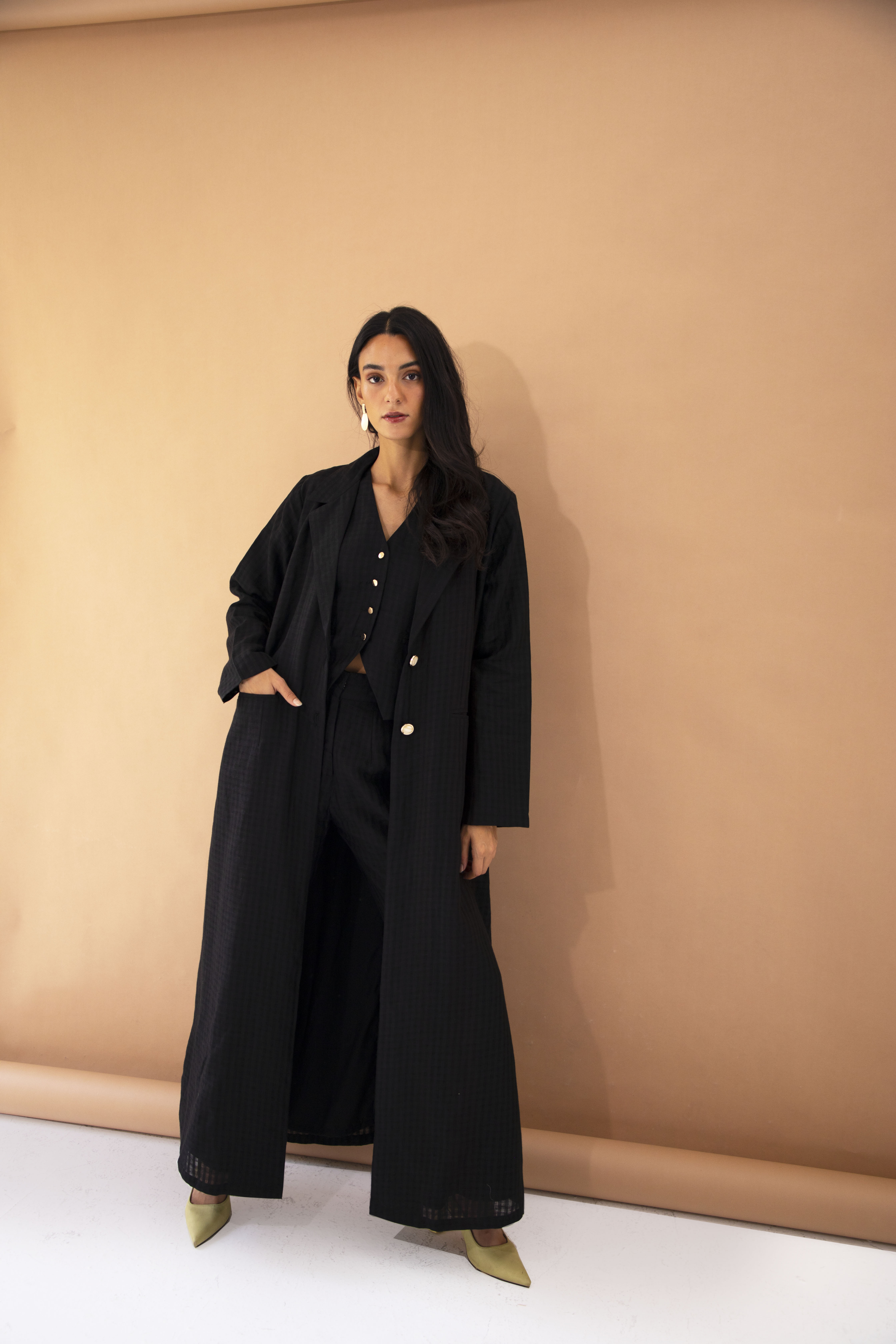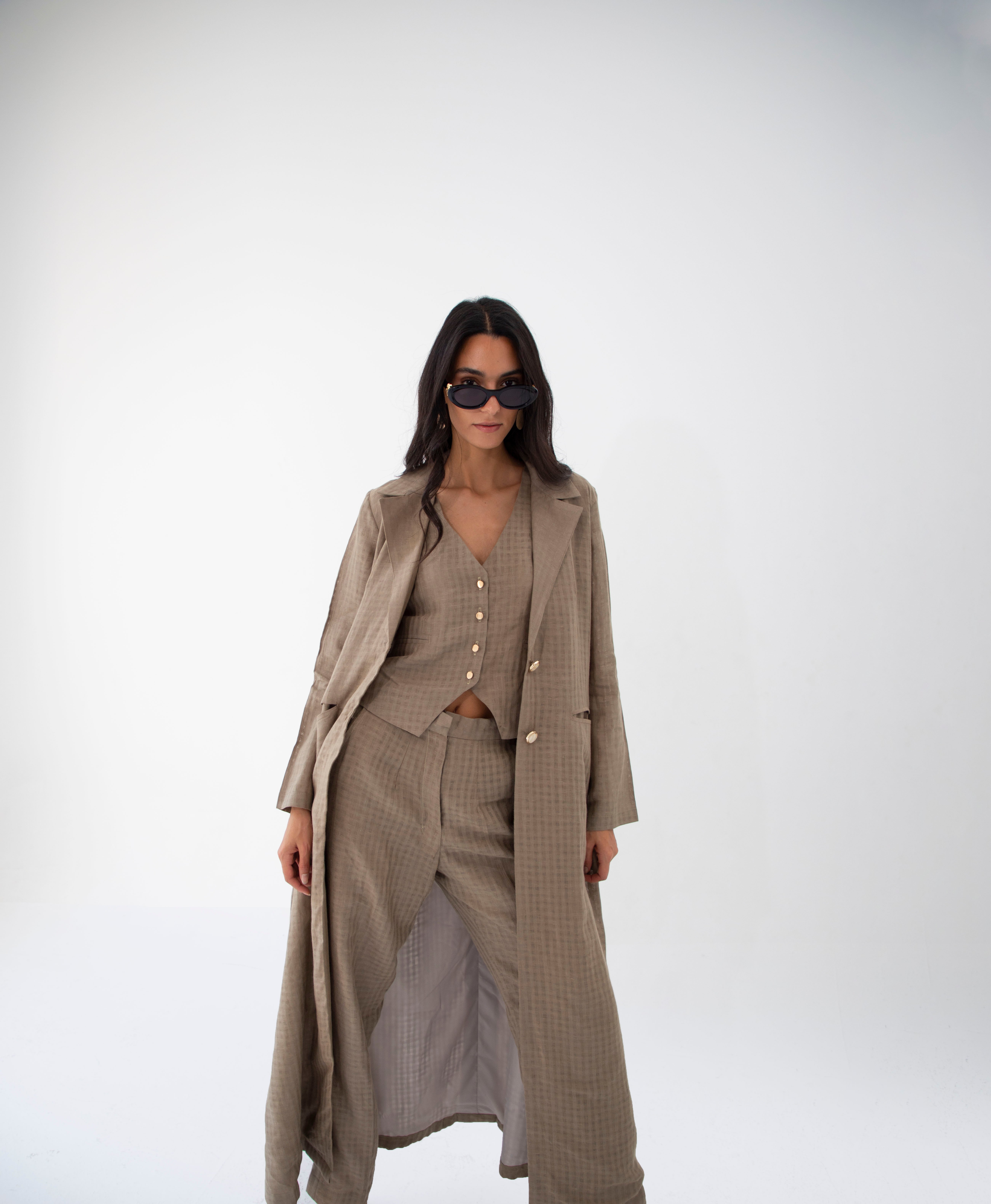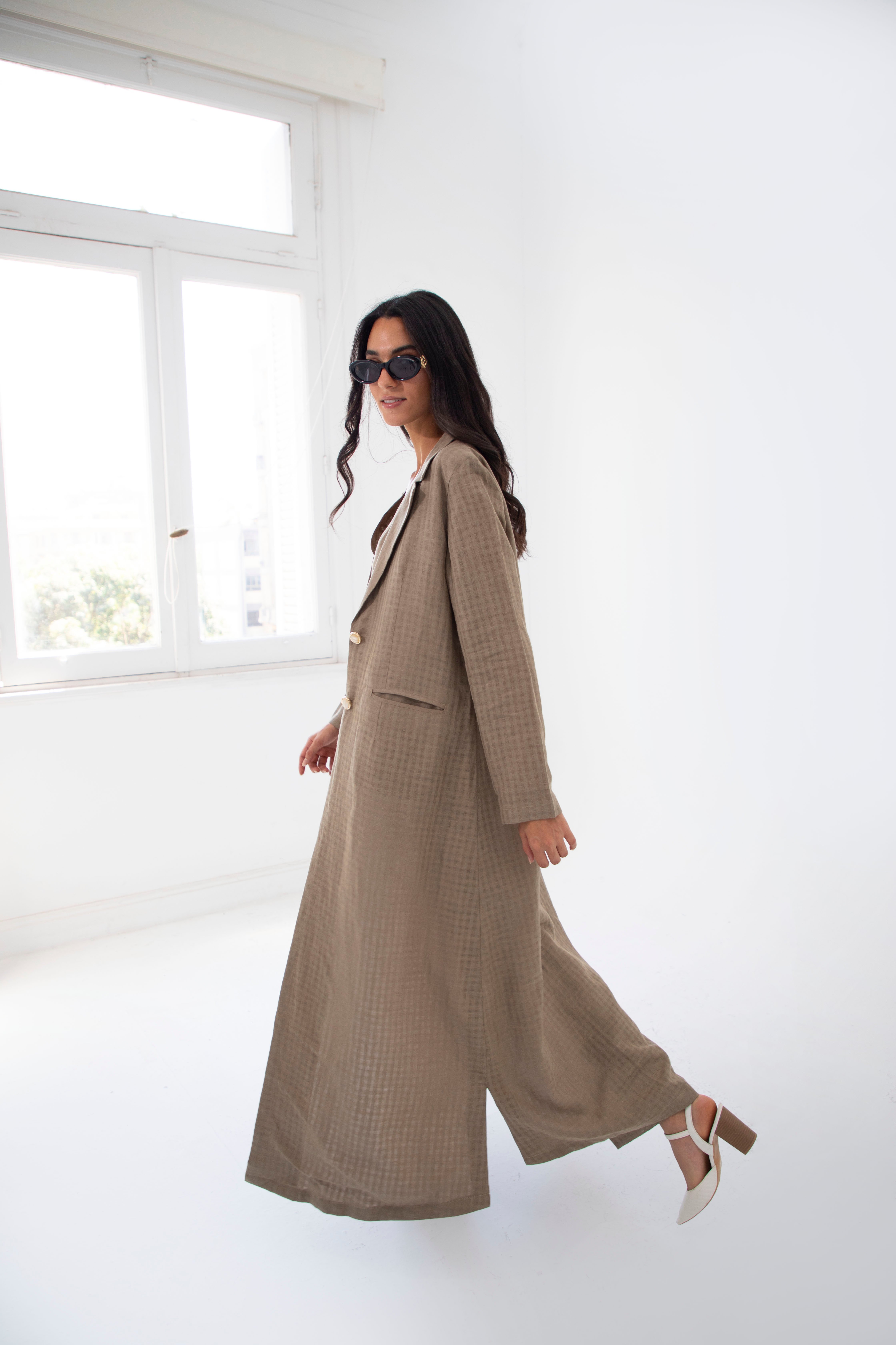 The linen blazer is designed for confident women. This blazer abaya showcases a clean lined, spread collar silhouette with golden marble buttons. its a statement piece for every season.