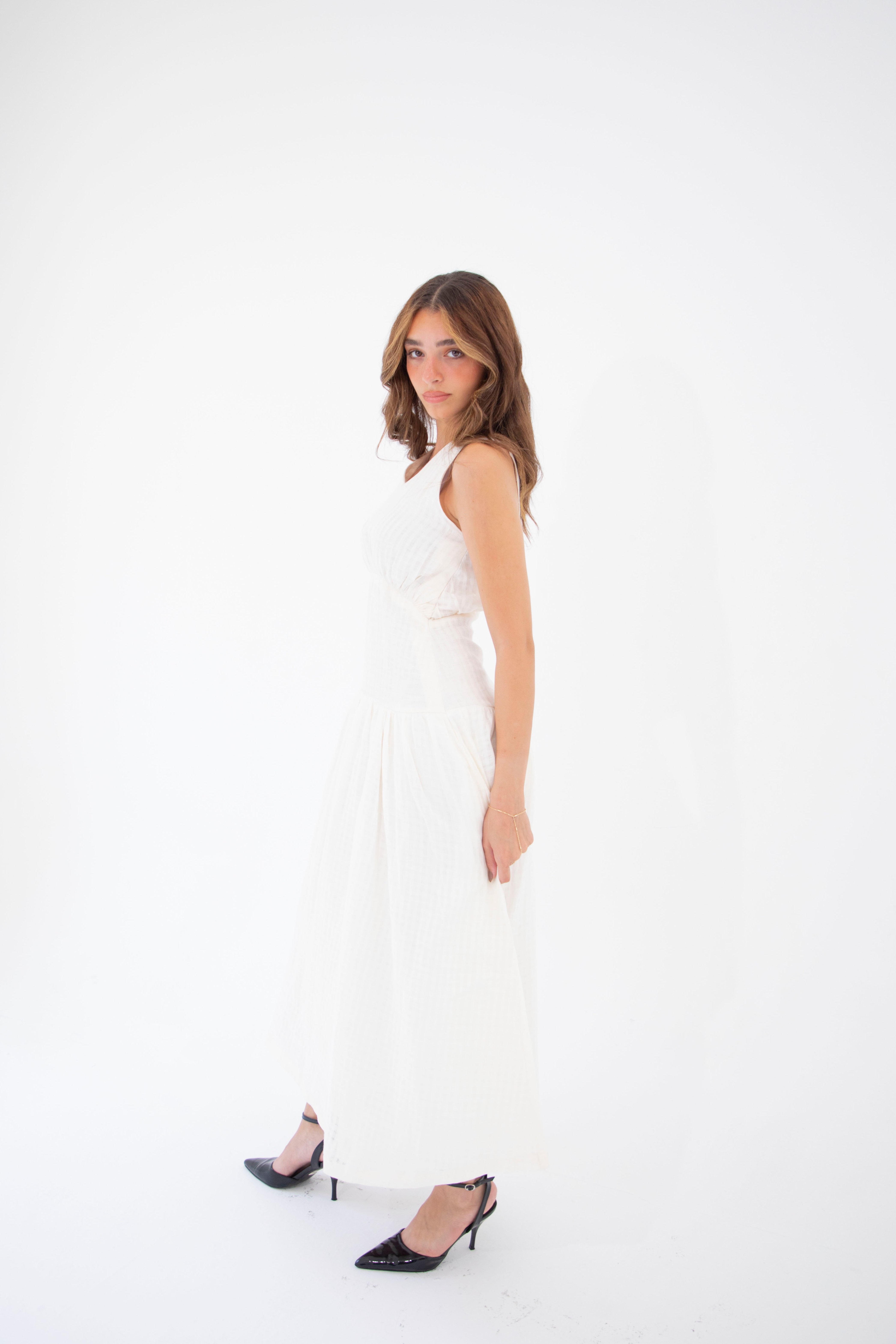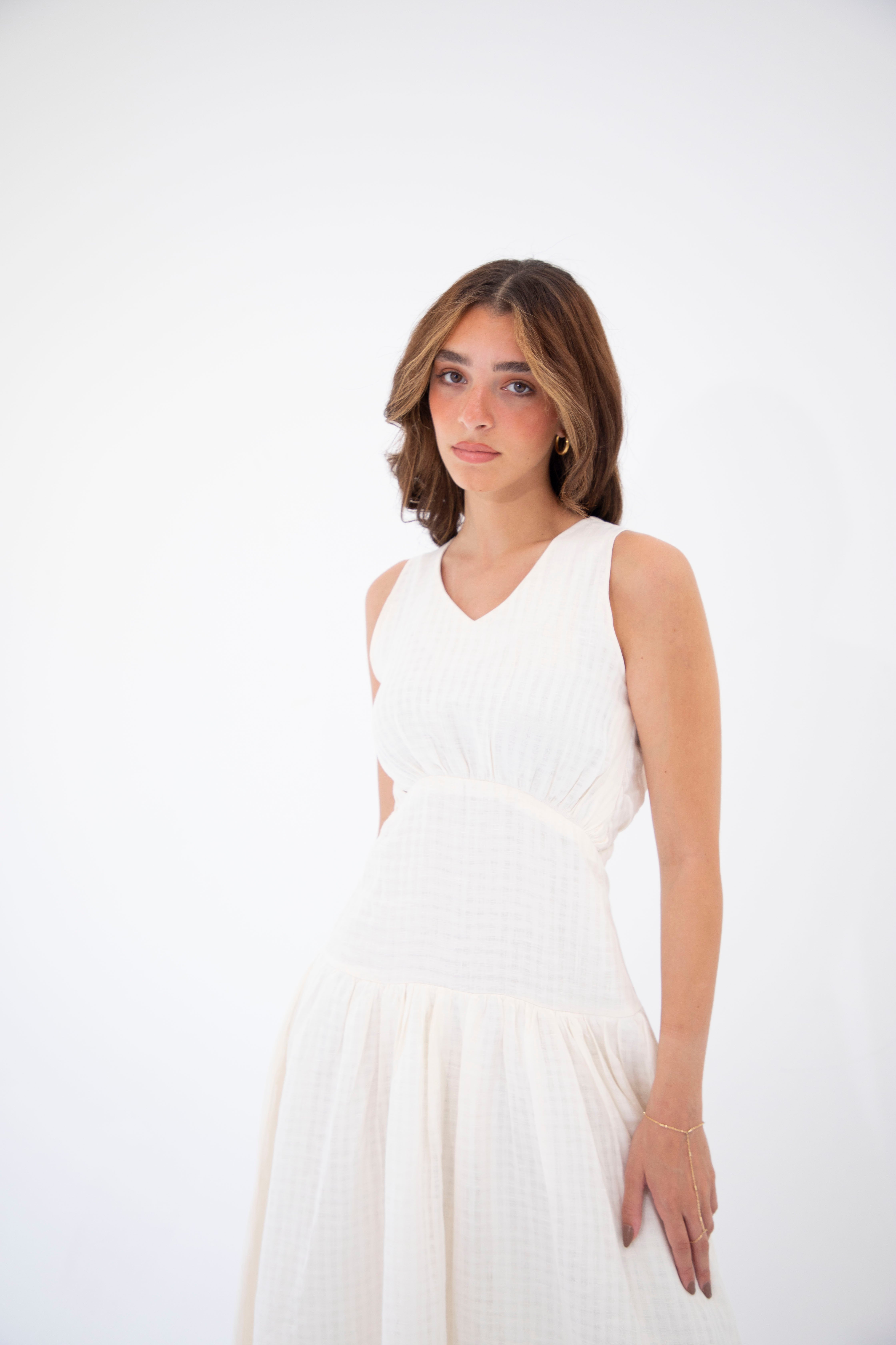 Classic and feminine, this sleeveless linen dress features a v- neckline and a simple curved waistband. It closes in the back with a hidden zipper and a gold button. Its perfect for an everyday look that can be styled in many ways.