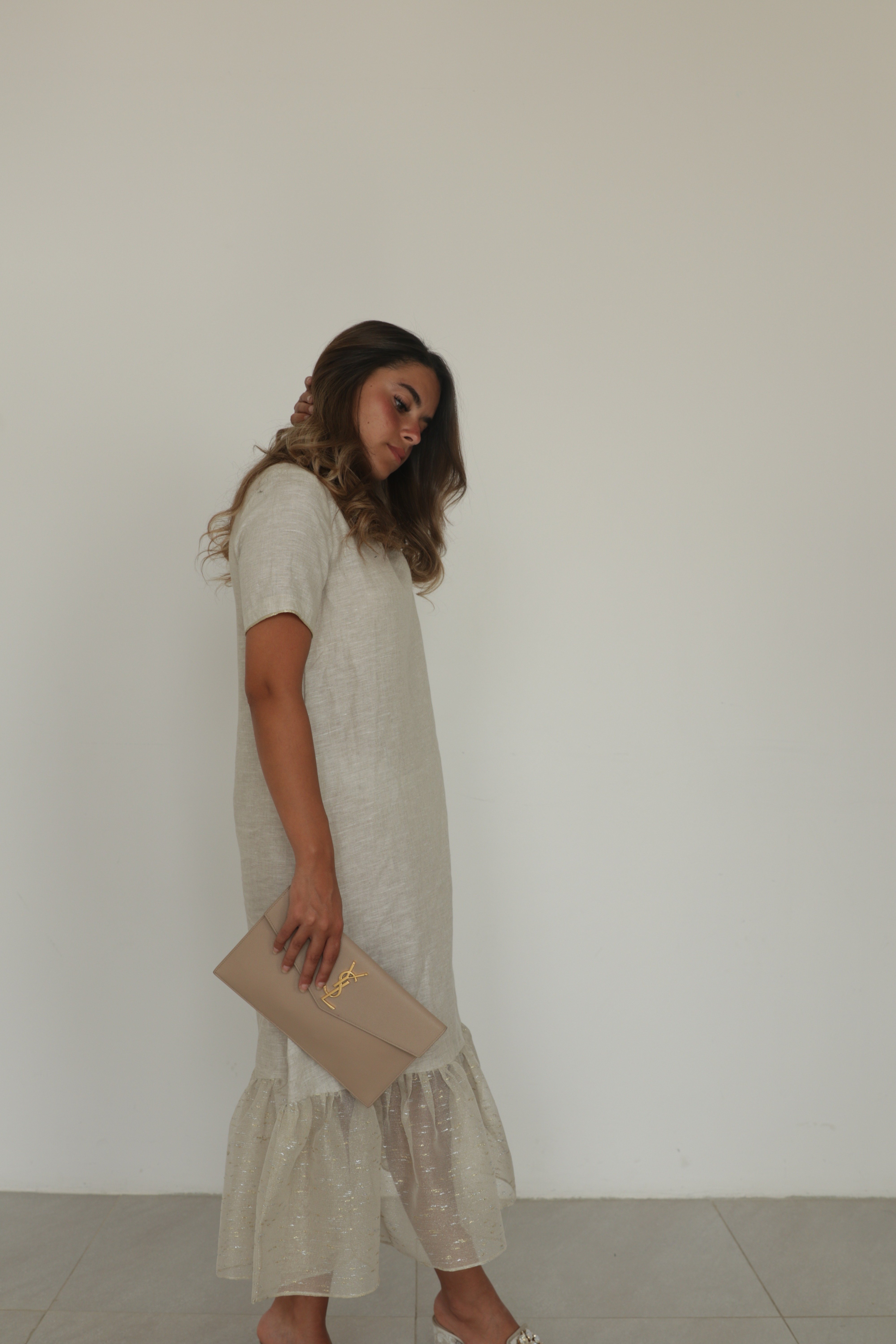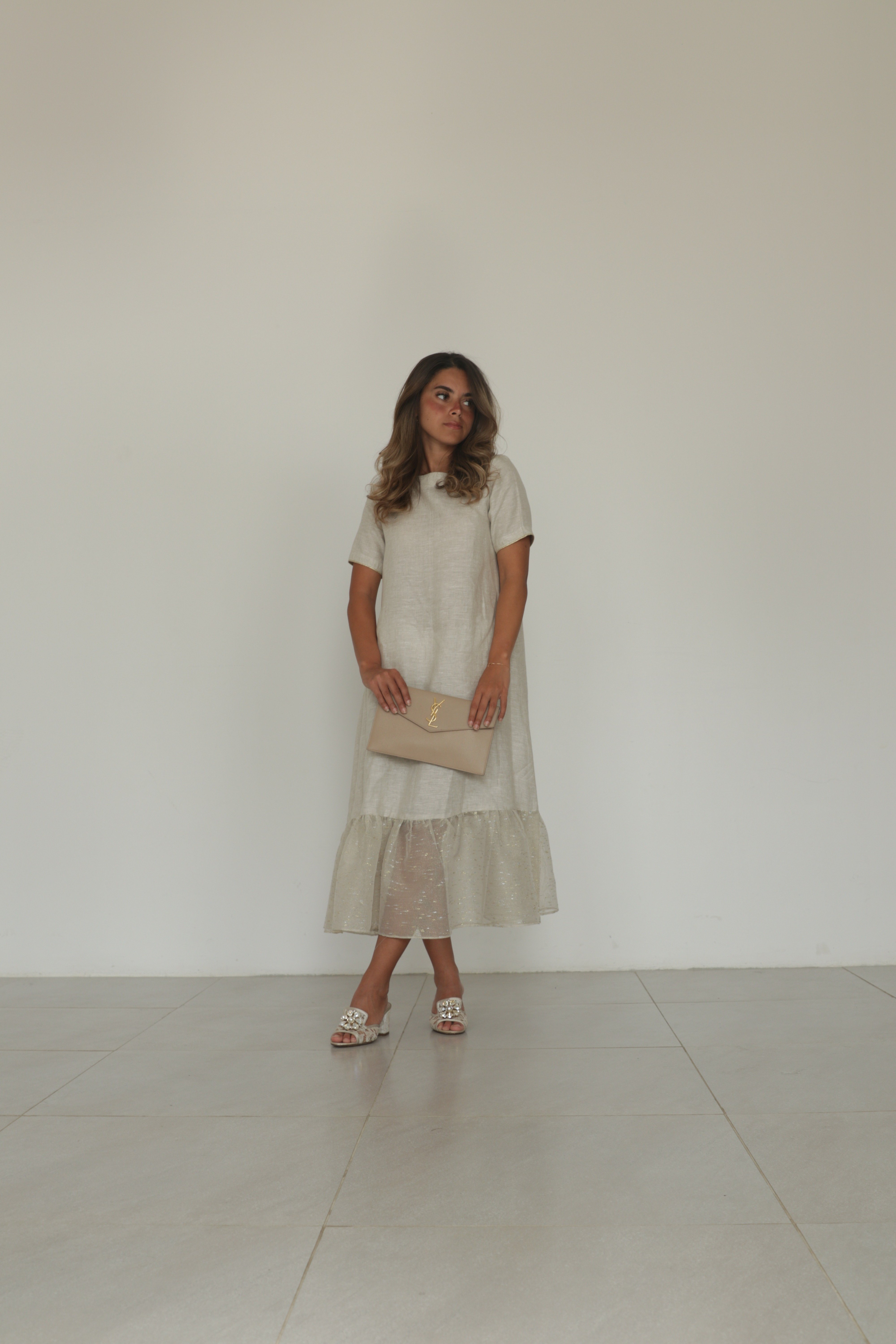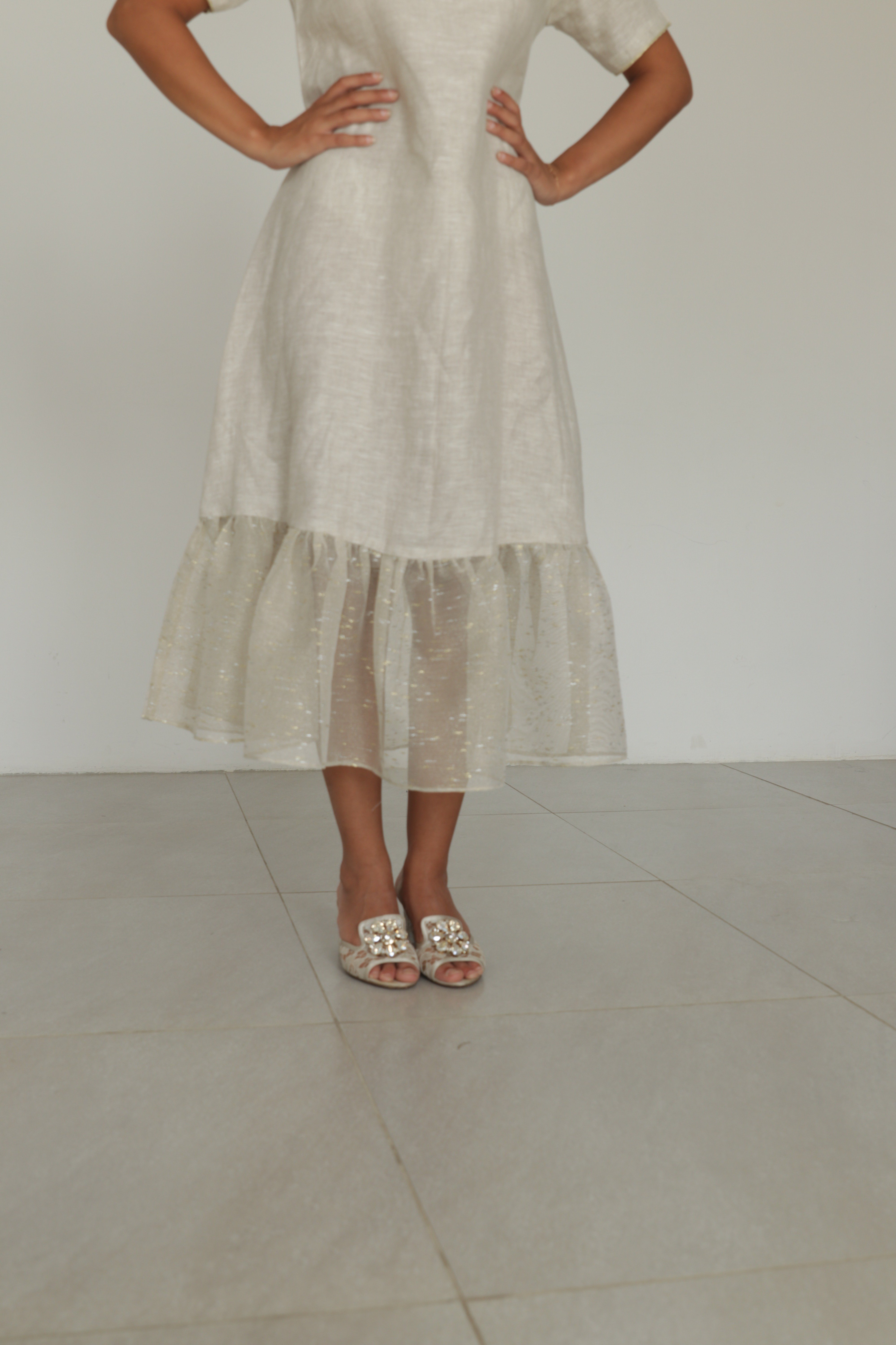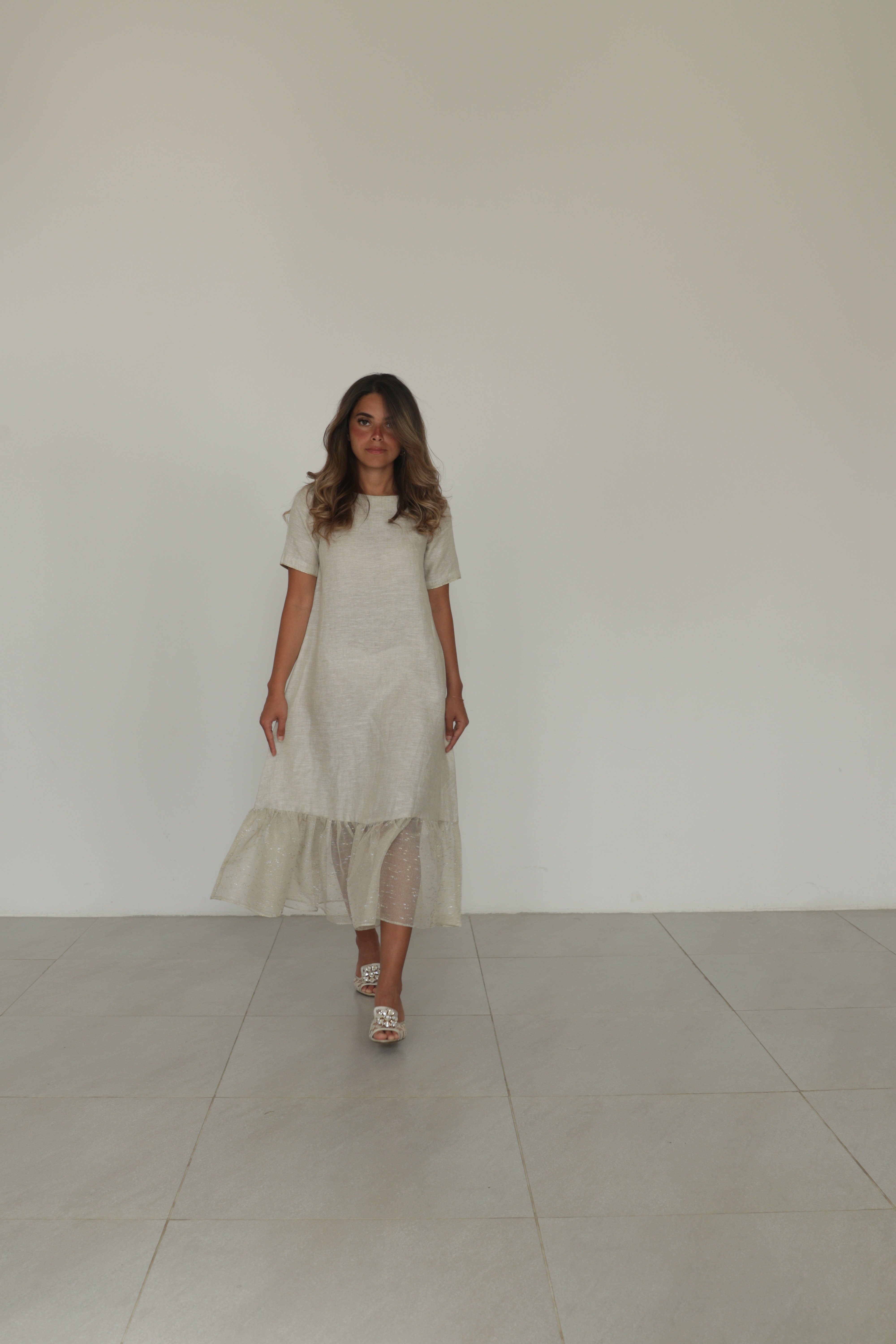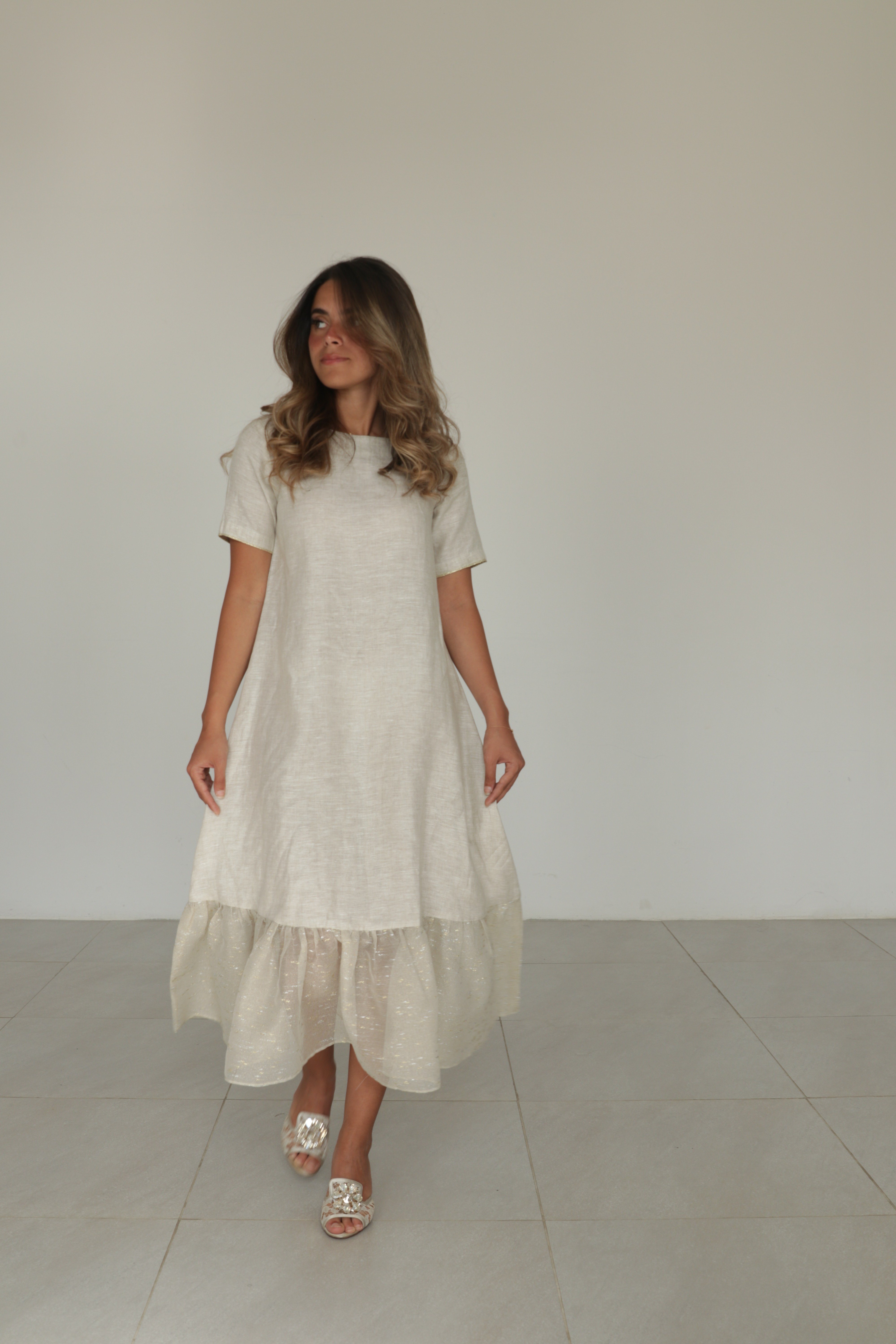 Beige linen dress with tulle ruffles
