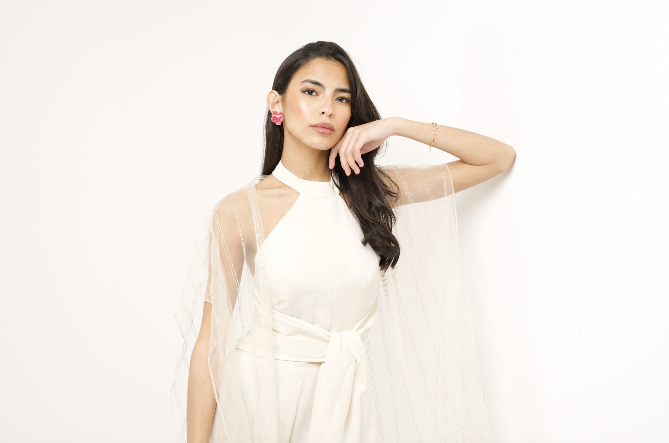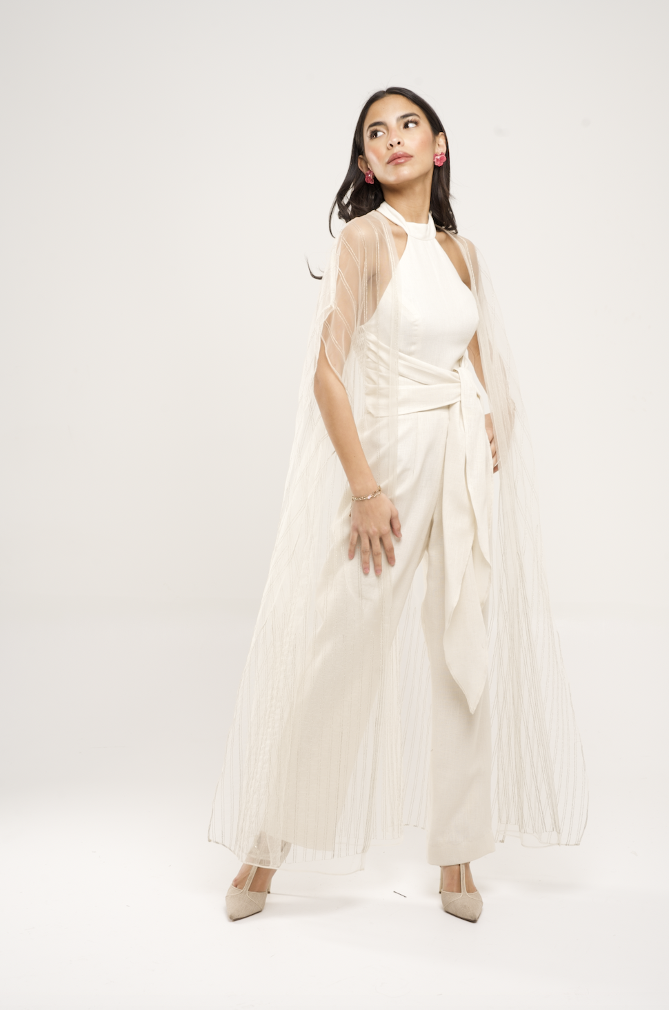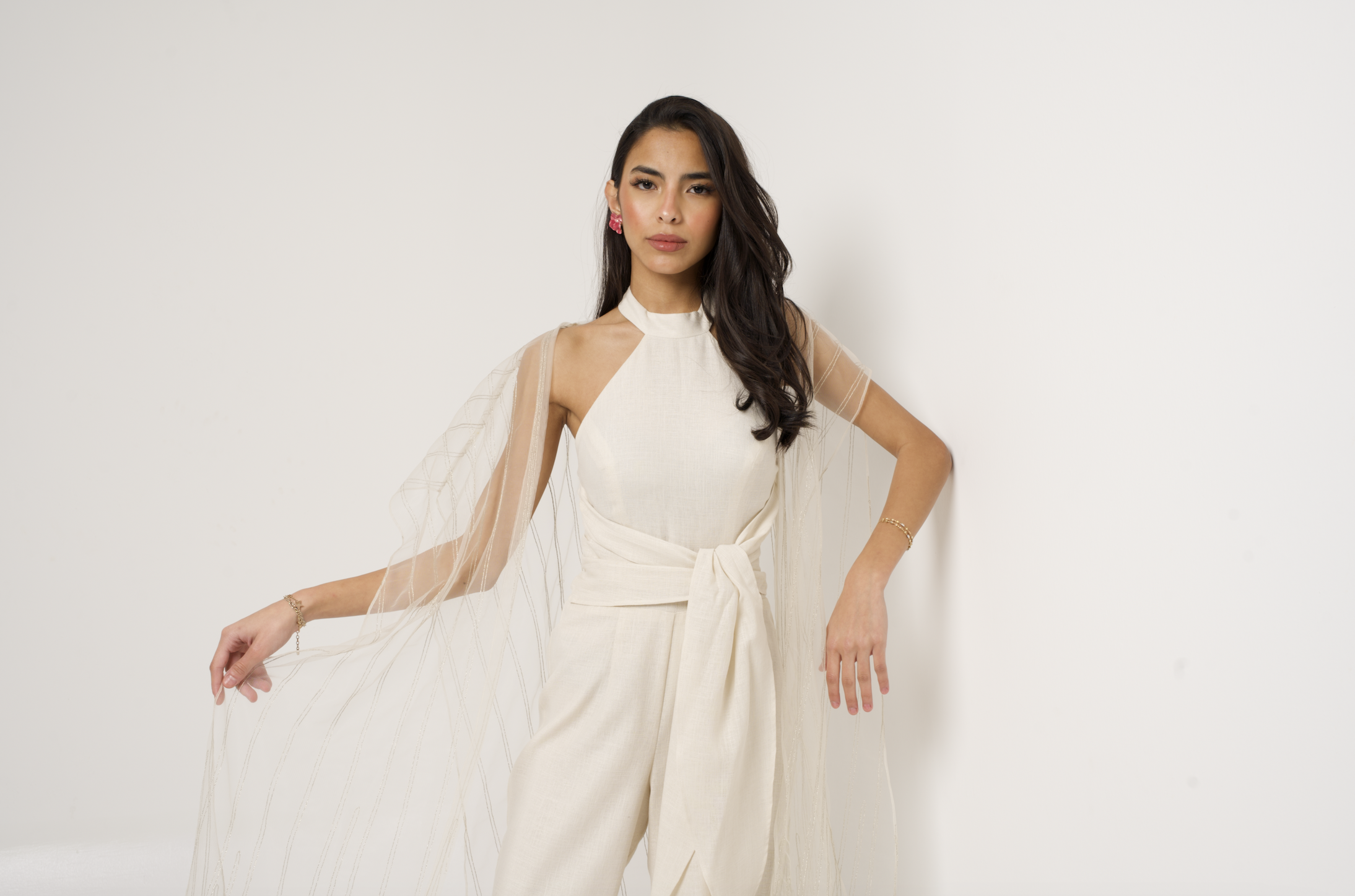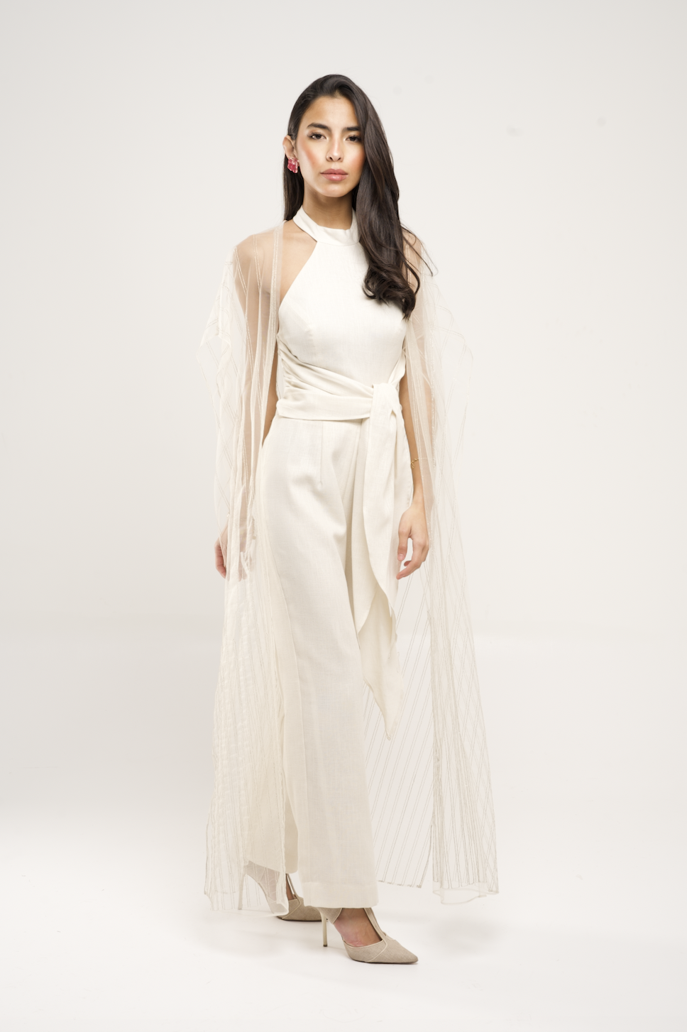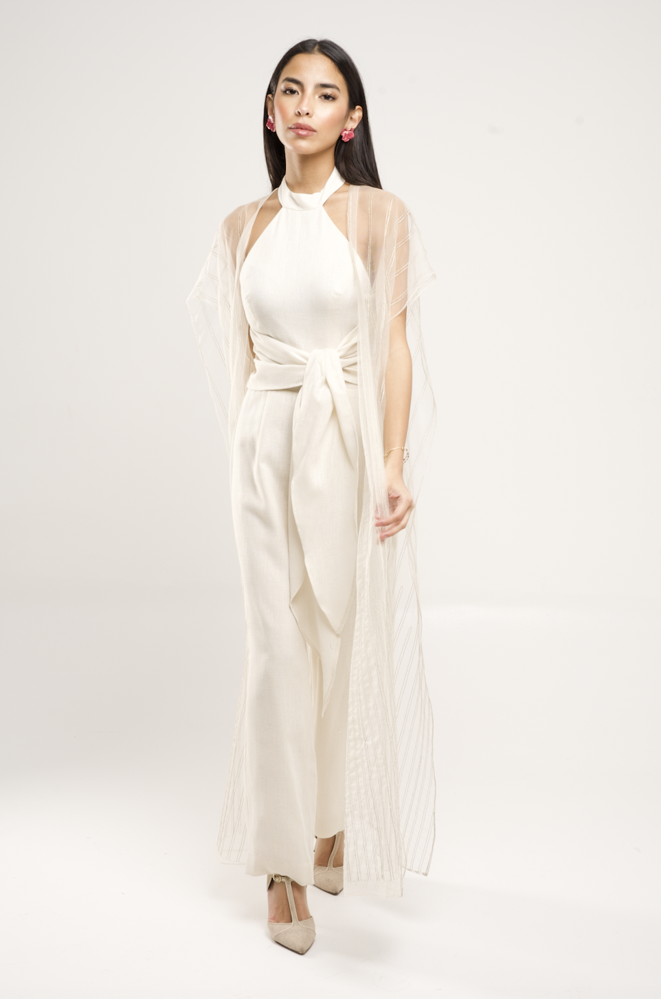 جمبسوت من الكتان مع كيب من التول مطرز بخطوط ذهبية.