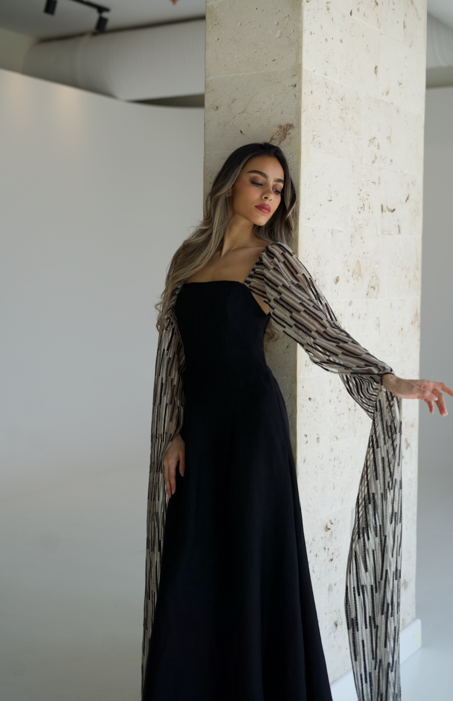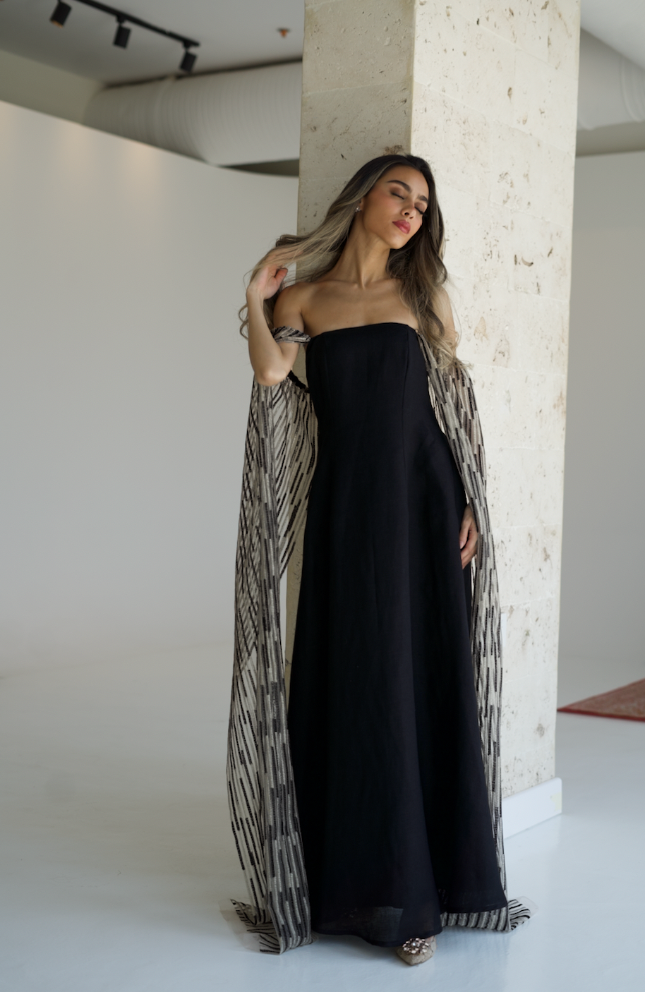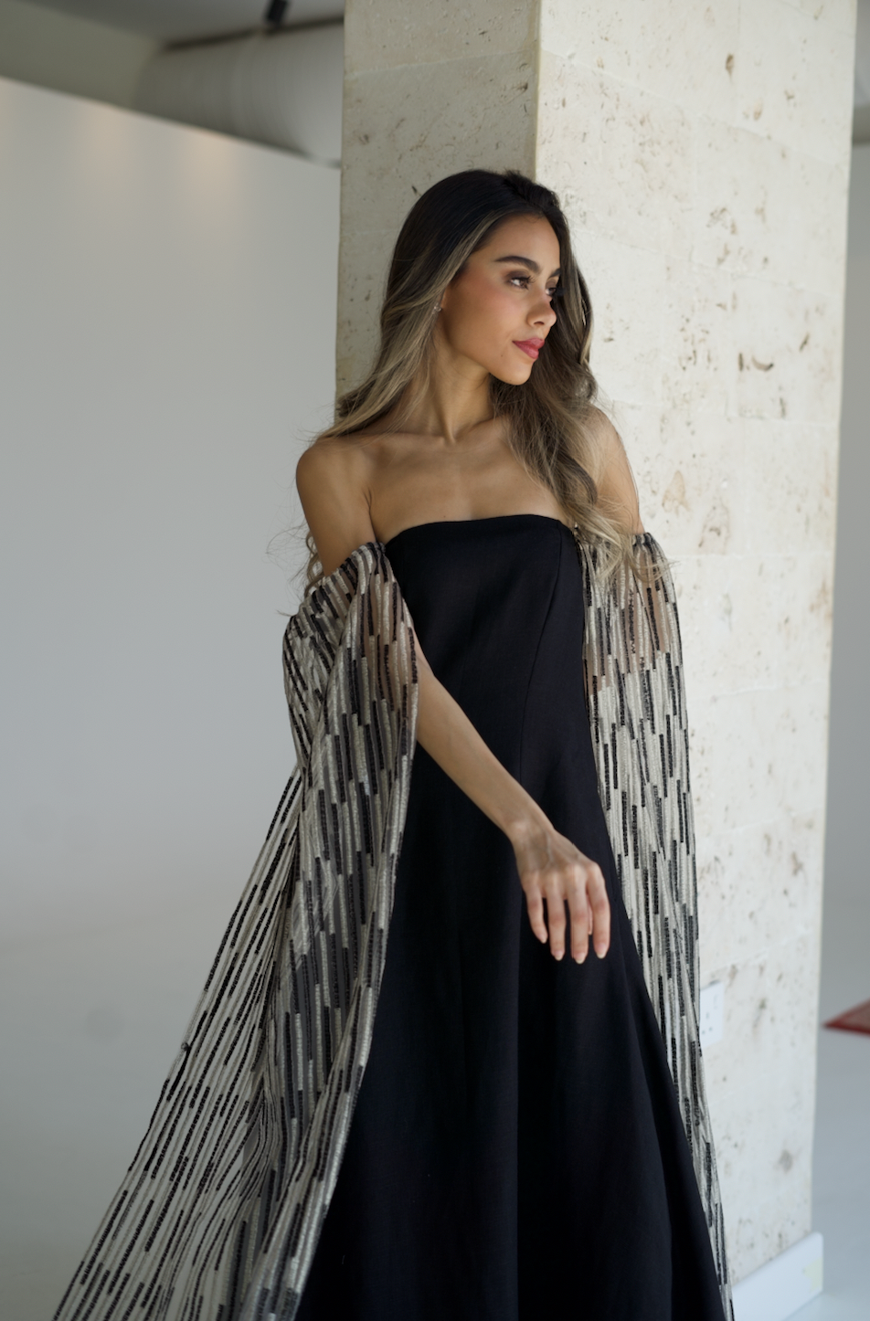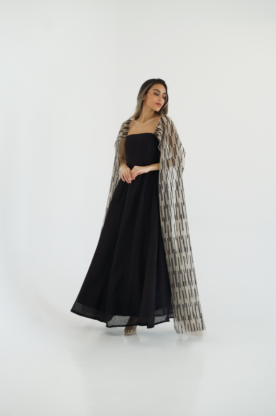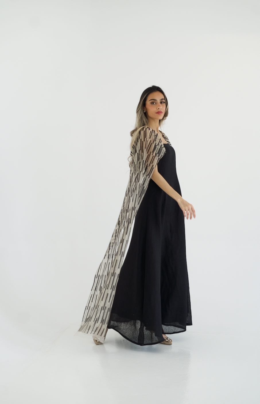 Black luxury classic linen dress featuring a beautiful wide embroidered tulle sleeves that can be worn in many ways.