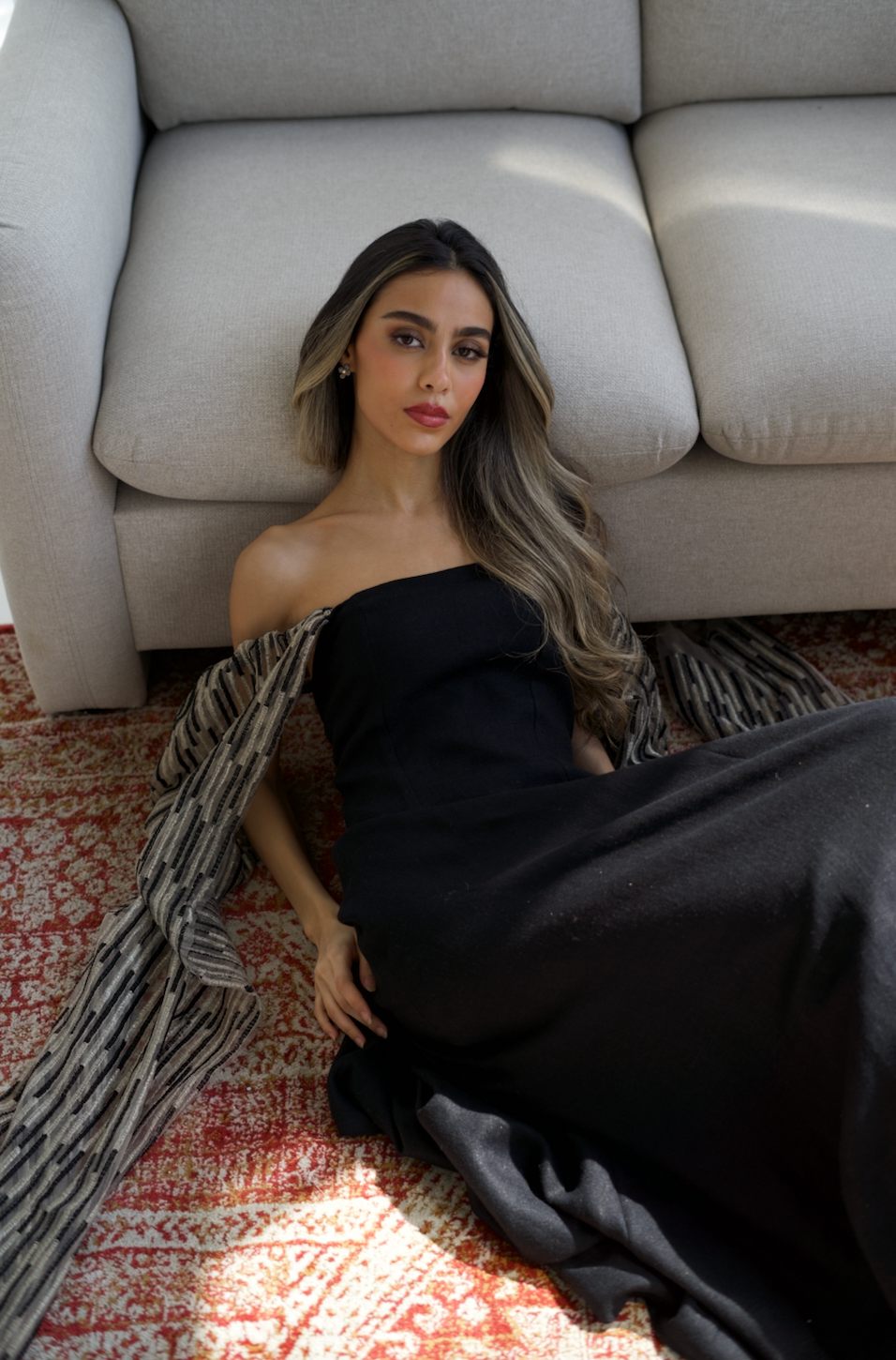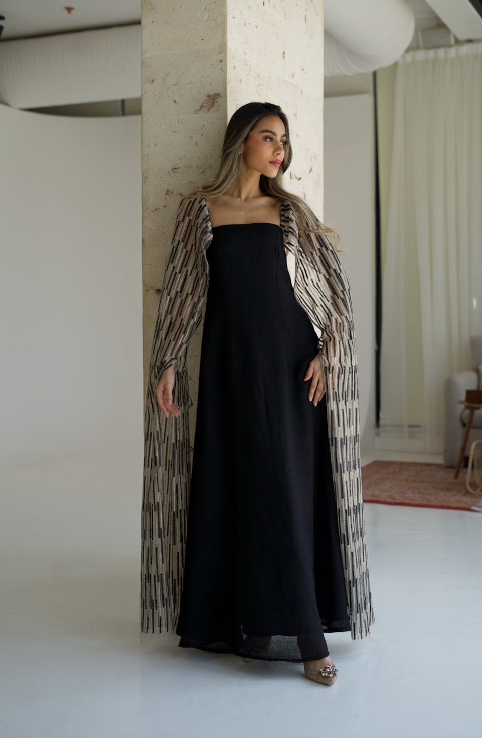 فستان أسود من الكتان الايطالي الانيق يتميز ب أكمام تل جميلة ومطرزة يمكن ارتداؤها بأكثر من طريقة