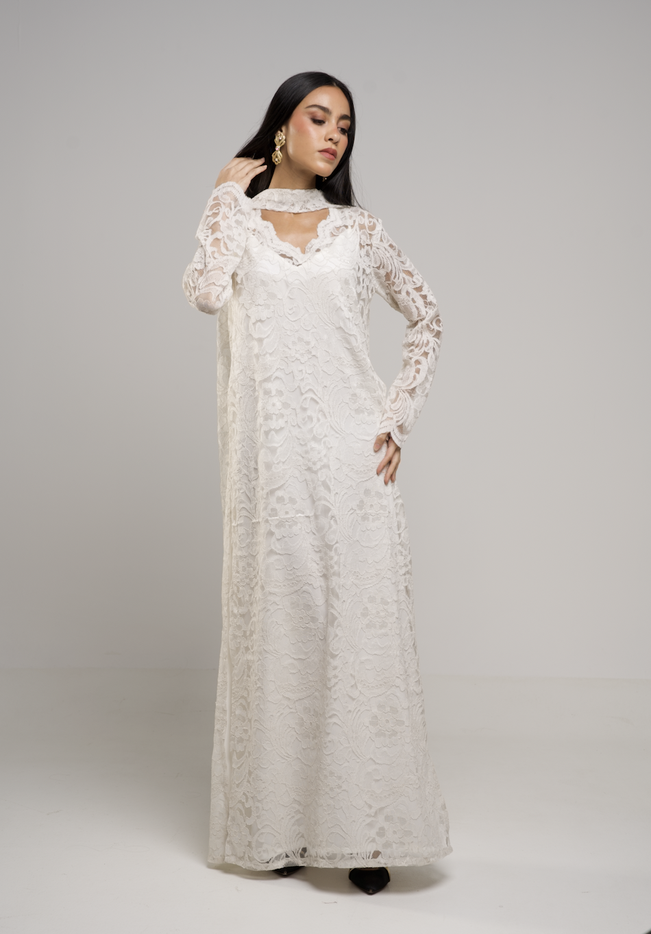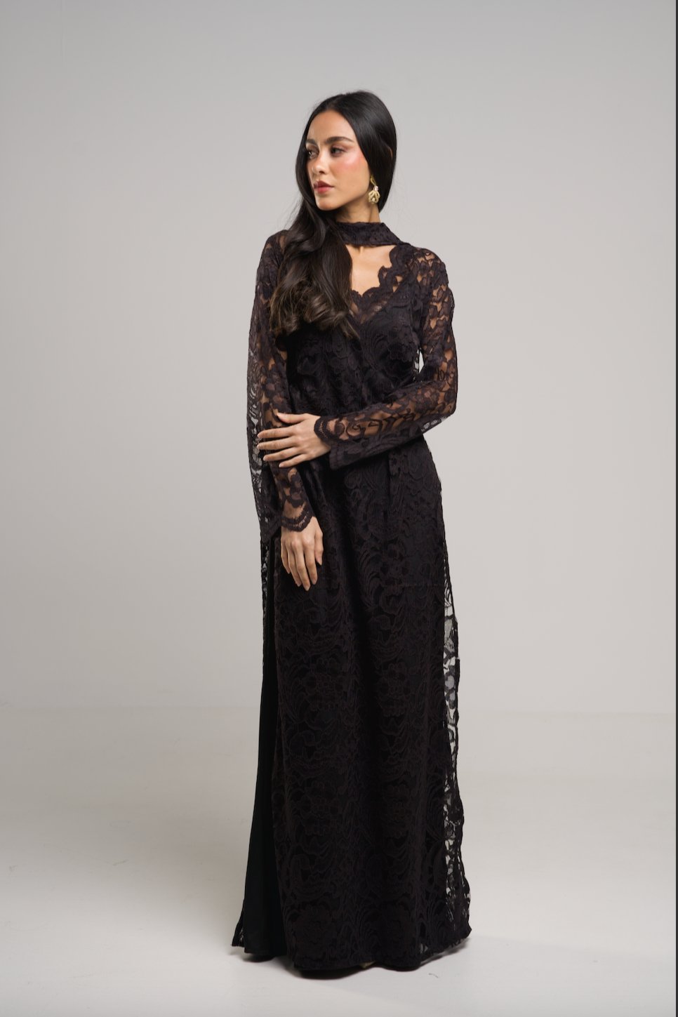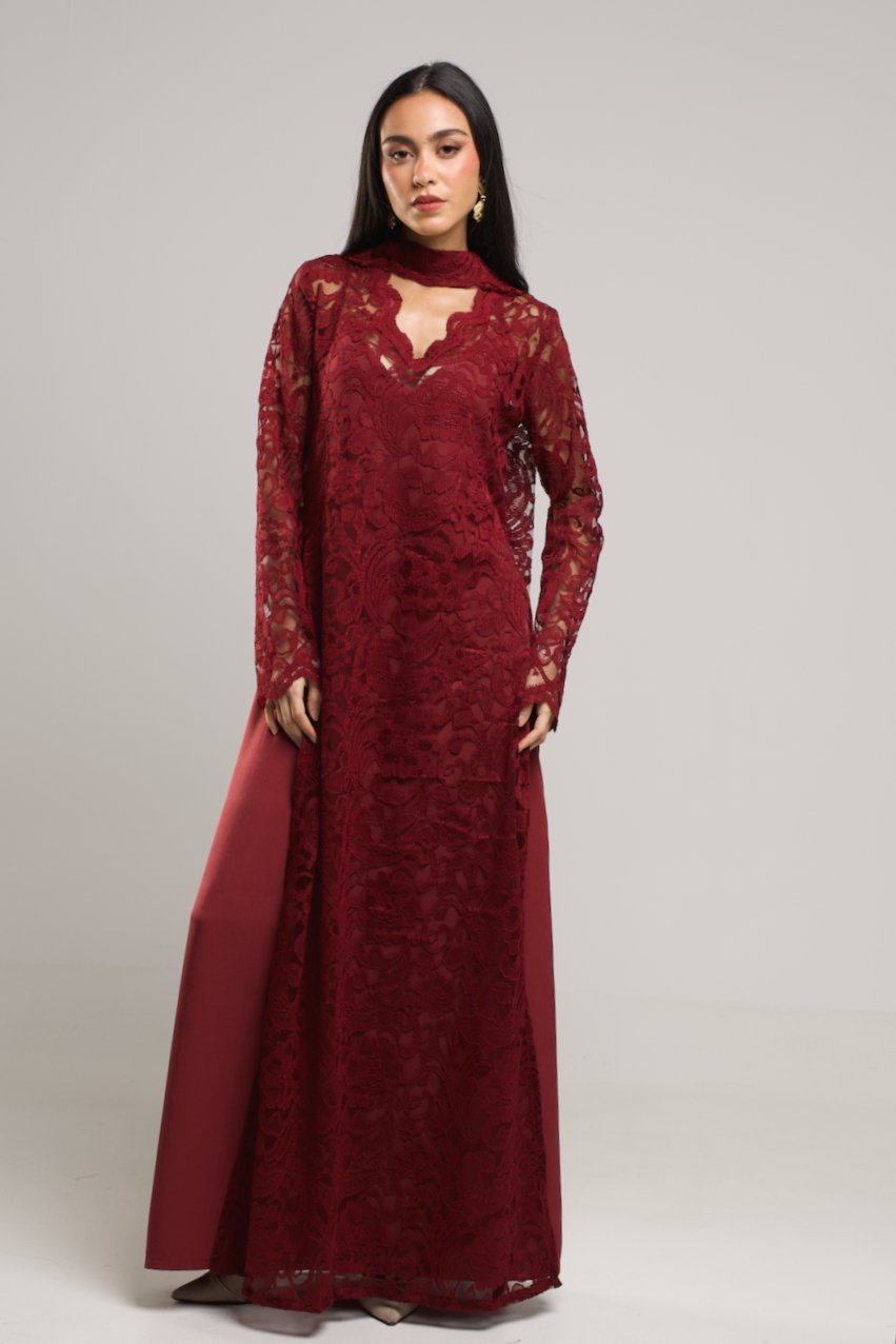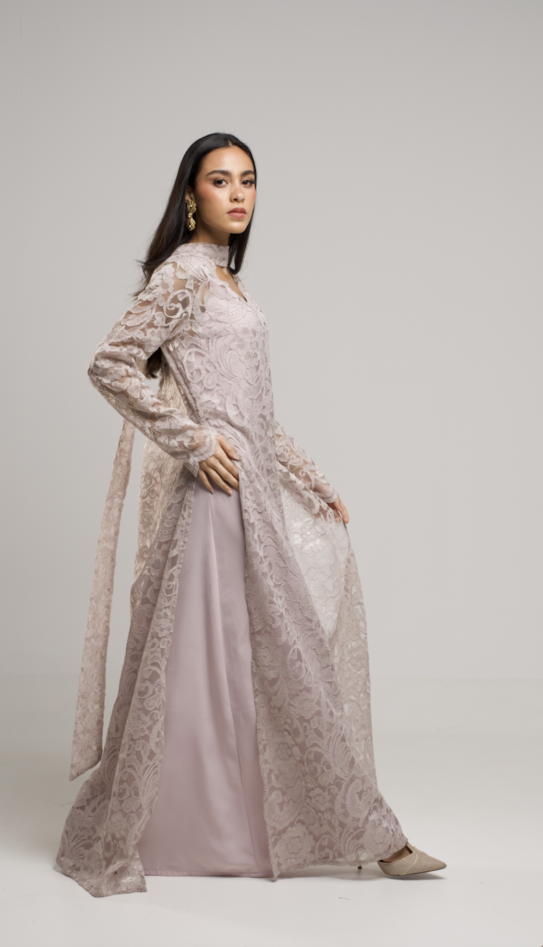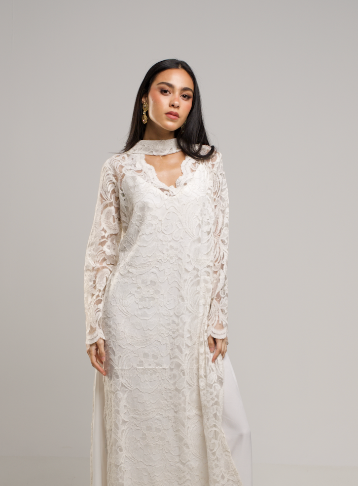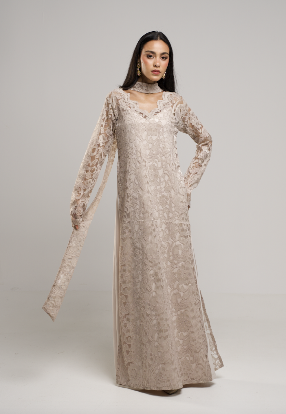 -Two pieces of inner silky linen dress with a full lace dress and scarf neckline that suits elegant nights.