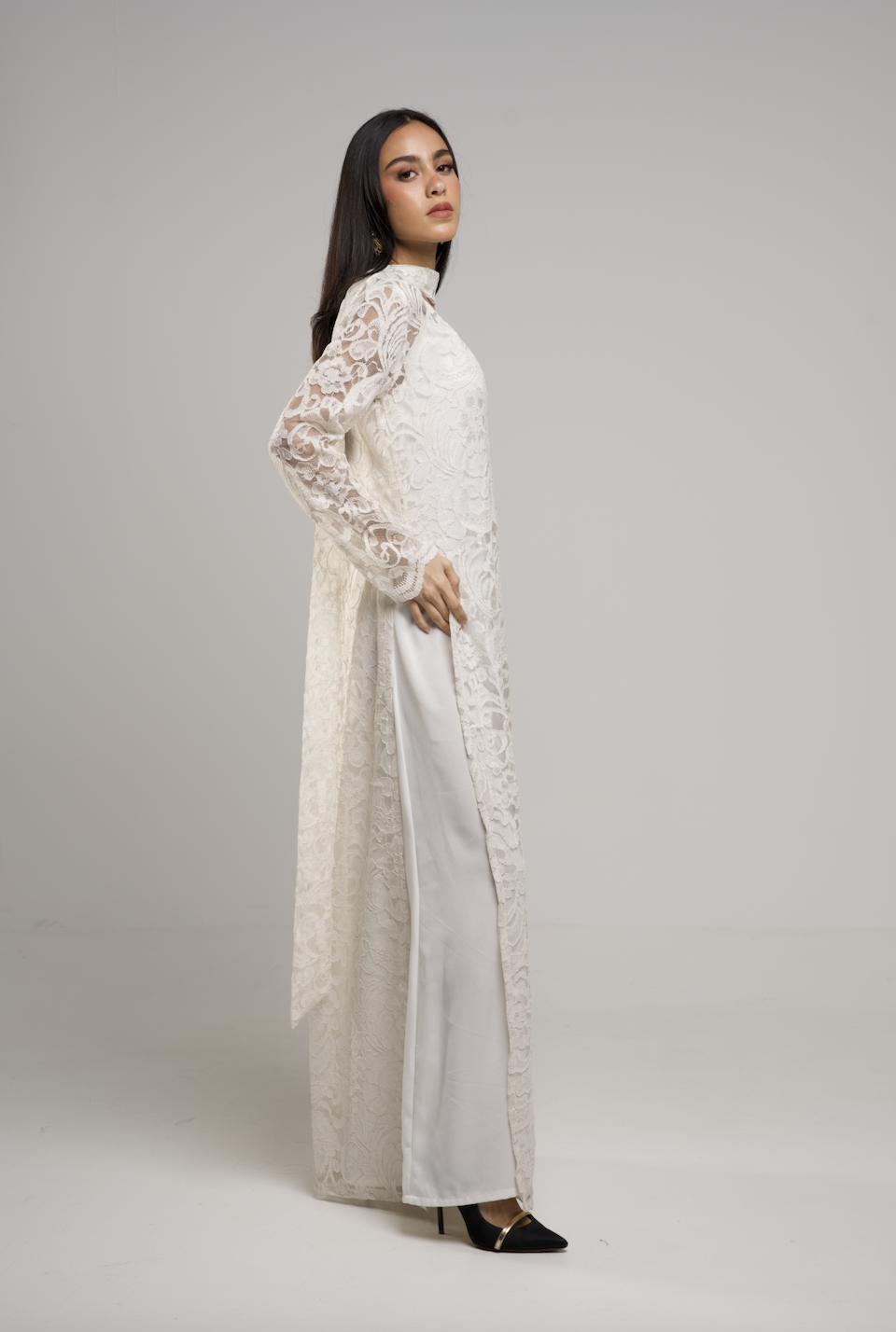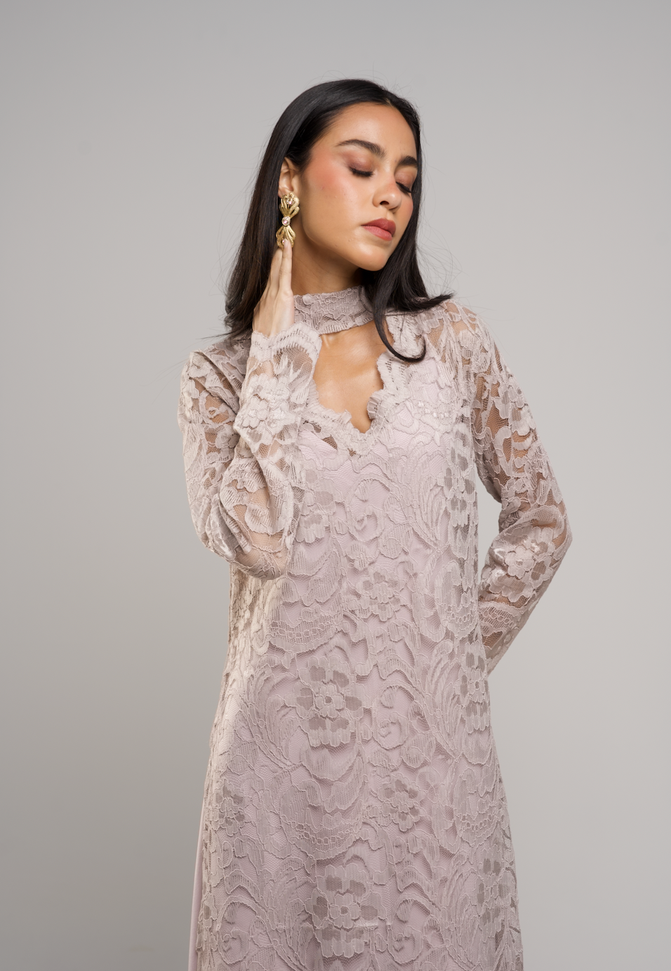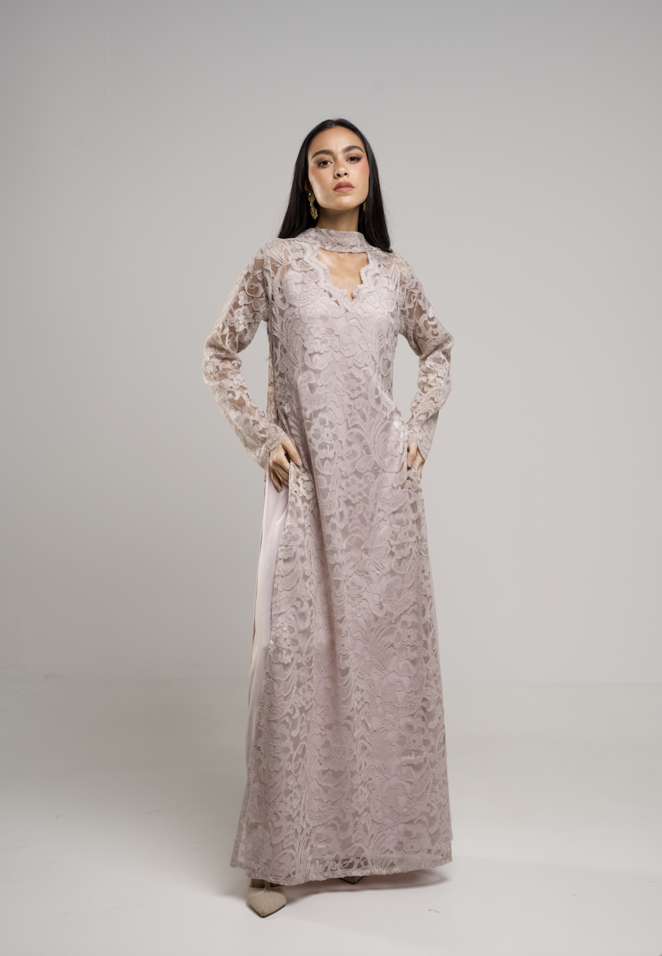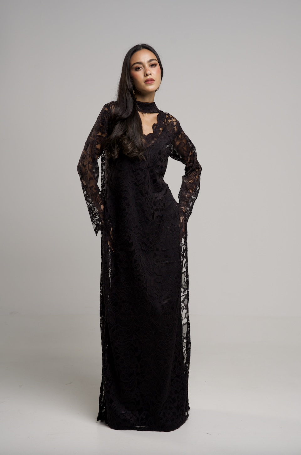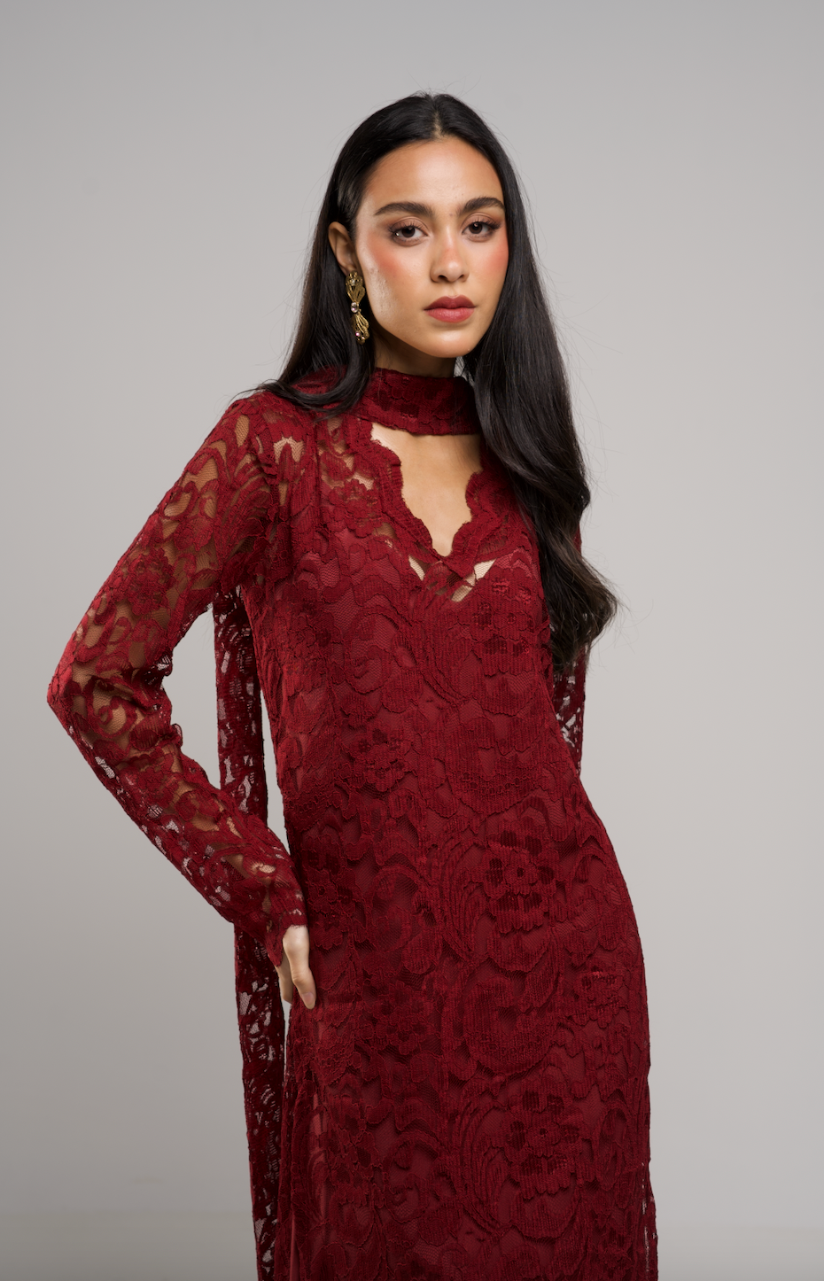-Two pieces of inner silky linen dress with a full lace dress and scarf neckline that suits elegant nights.